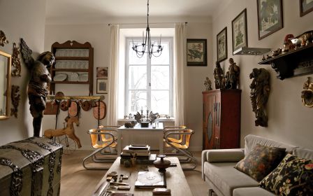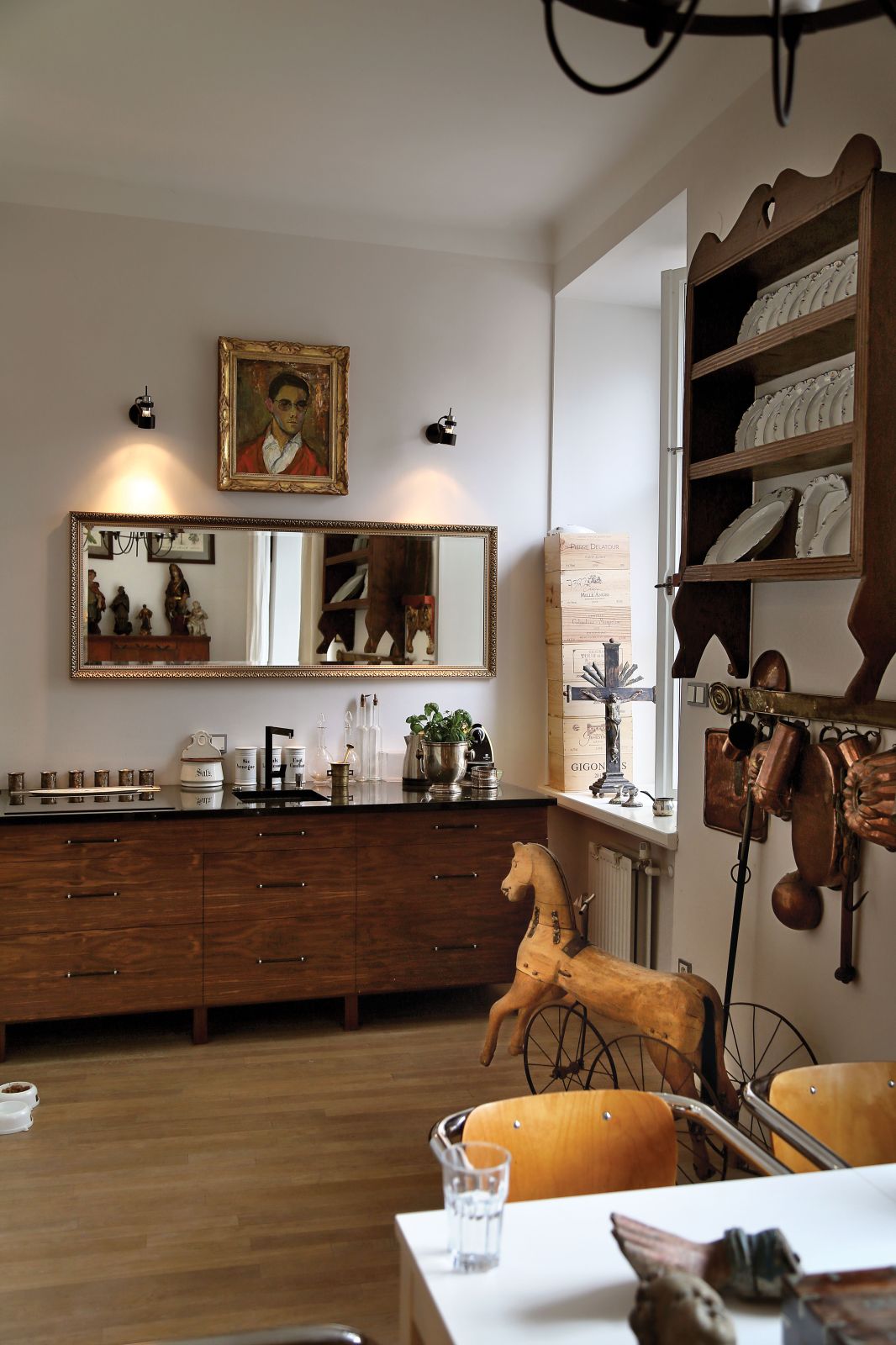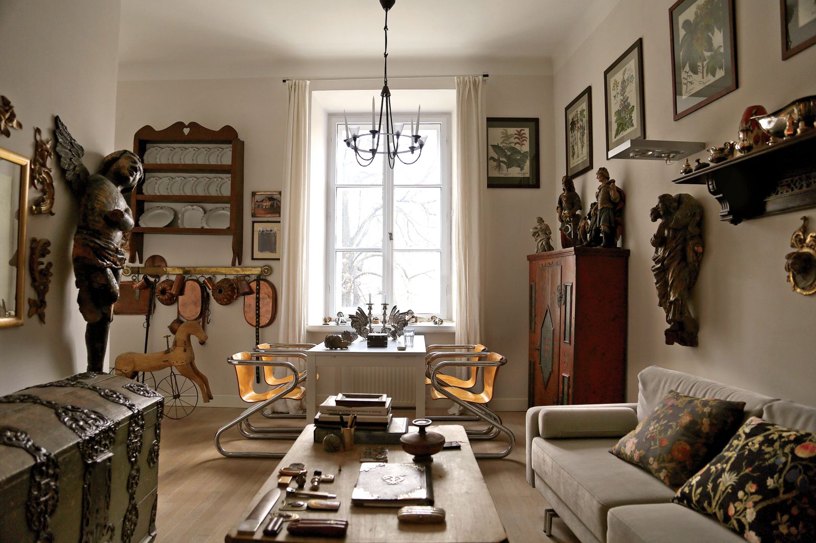 Do mieszkania na Starówce pan Filip wprowadził się dwa lata temu. Zmienił nieco układ ścian, by połączyć salon z kuchnią. Jest jeszcze sypialnia i łazienka. A także dwie garderoby, bo to najważniejsza sprawa, gdy się ma trzydzieści garniturów i dwa razy tyle par butów. – To typowe mieszkanie dla singla – mówi. Jedynym współlokatorem jest Heniek: ogromny, rudy kot rasy maine coon. – Został mi po żonie – śmieje się gospodarz. Wystrój wnętrza determinuje kolekcjonerska pasja właściciela. I tak nie zmieścił całych swoich zbiorów. Piękne przedmioty po prostu się go trzymają. – Jak ktoś handluje pieniędzmi, zawsze zostają mu pieniądze – stwierdza. – Mnie interesują antyki. Kilka rzeczy kupię, część sprzedam, a resztę mam dla siebie. Kupuje przede wszystkim na targach staroci, częściej we Francji niż w Polsce. Meble, srebra, zegarki, bibeloty.