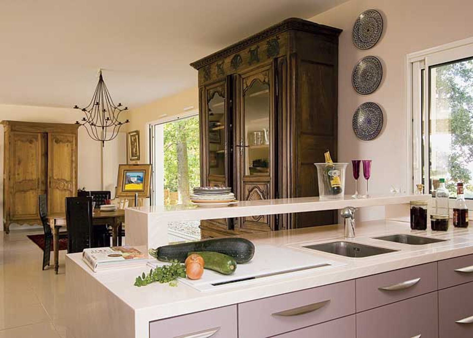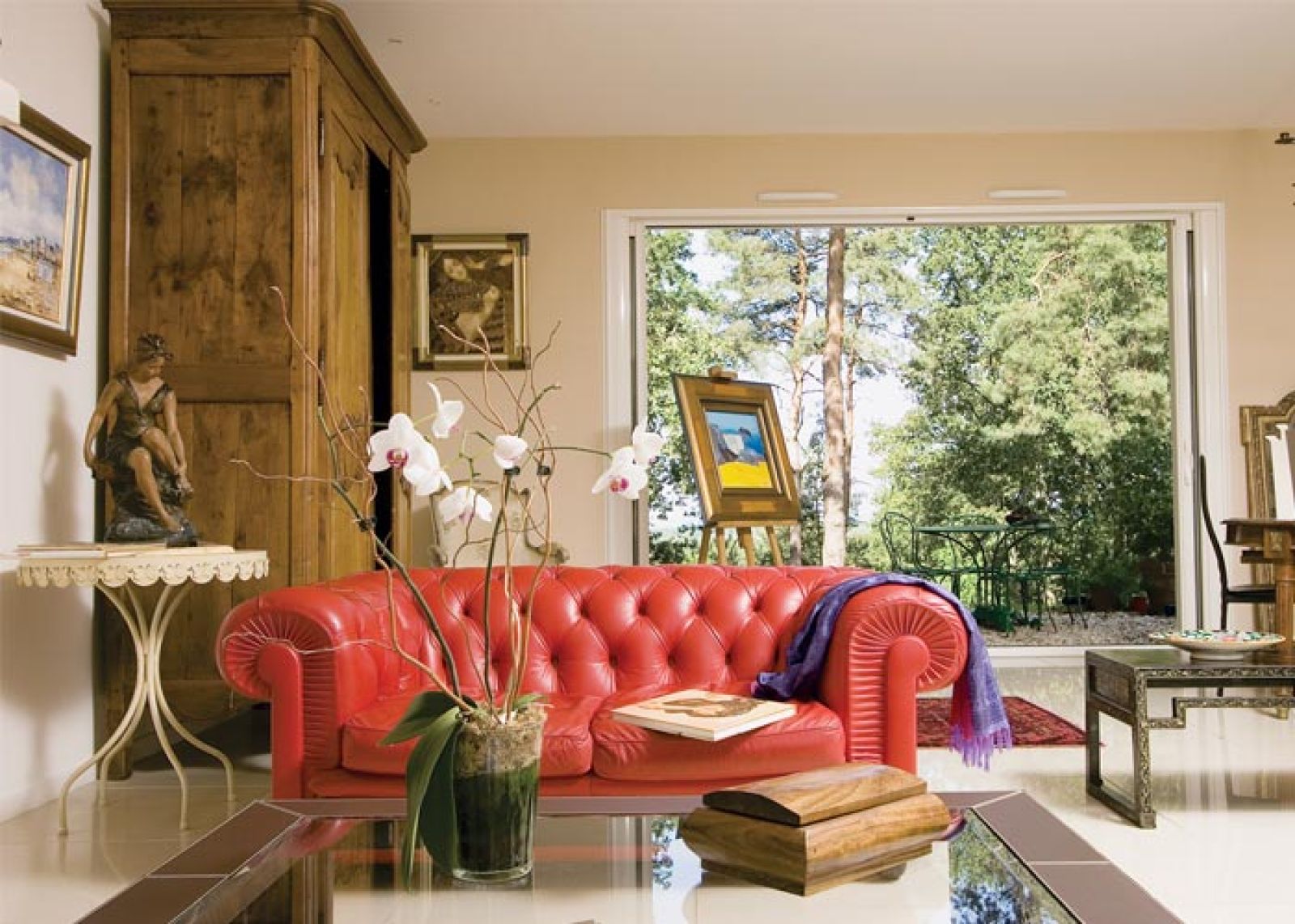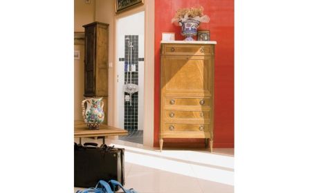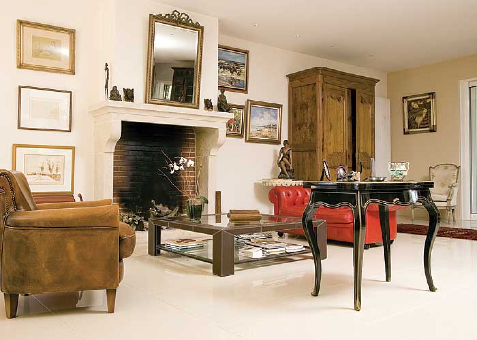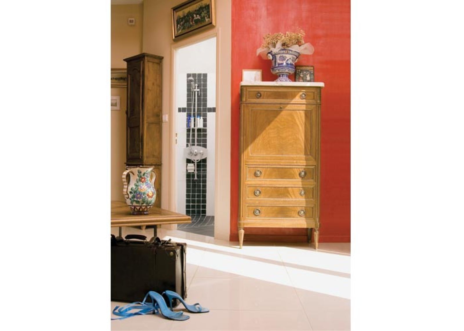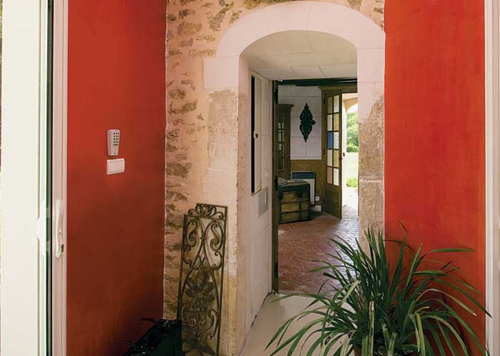 W tym czasie Armelle miała coraz to nowe pomysły. – Niełatwo połączyć nowoczesny charakter wnętrza, odważną kolorystykę ścian ze stylem rustykalnym, antykami. Trzeba uważać, aby nie przesadzić – tłumaczy Armelle. W salonie w centralnym punkcie stoi tradycyjny burgundzki, wiejski kominek, podłoga jednak odbiega od stylu. Zamiast ceglastej terakoty zdecydowała się na polerowany gres w odcieniu écru. Podobnie jest w holu łączącym dom z wieżą: wiekowy kamień i ściany pomalowane na czerwono, a nad drzwiami lustro – oryginalny Ludwik XVI.