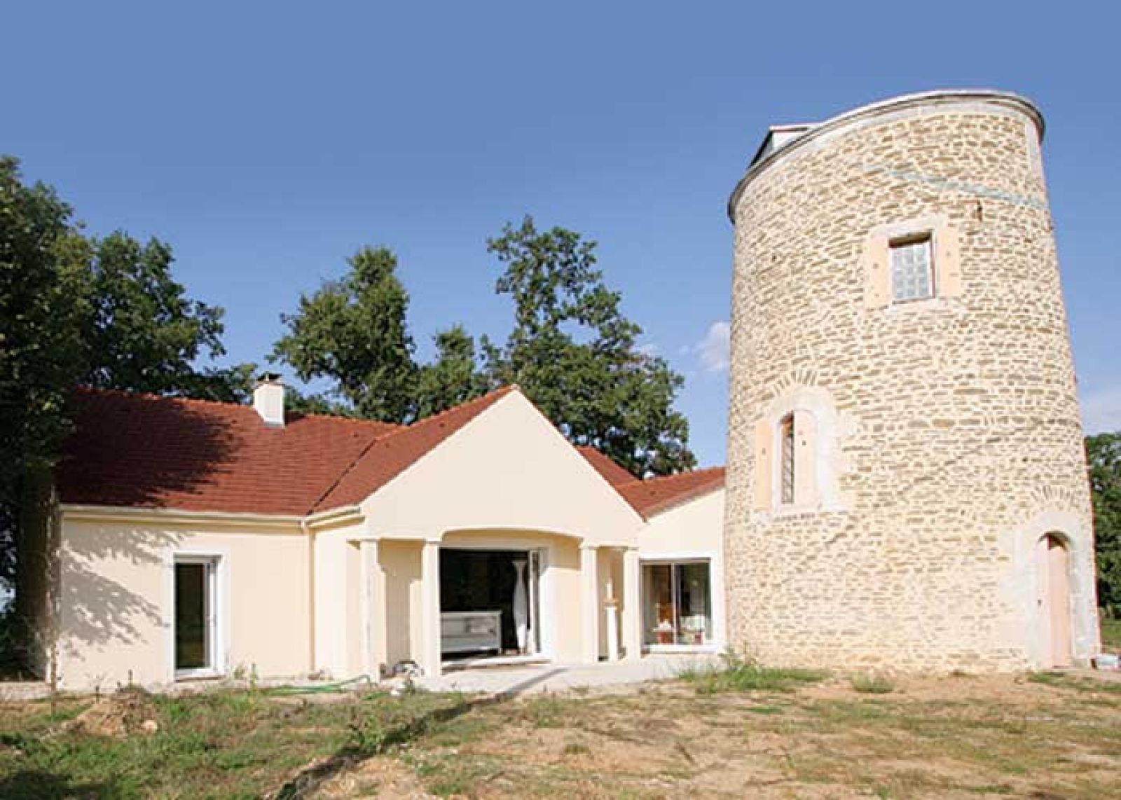 Kupili działkę z XVIII-wieczną wieżą, która na przestrzeni dziejów była też wiatrakiem. Wyglądała „jak nowa”, bo poprzedni właściciel też miał do niej wyjątkowy sentyment. Postanowili dobudować do wieży dom. Nie obeszło się bez kłopotów. Trzeba było wykarczować kawał lasu, a projekt musiał spełniać obowiązujące w okolicy bardzo surowe wymogi architektoniczne – konkretne nachylenie dachu, określona wielkość okien, obowiązkowe okiennice; narzucono nawet kolory stolarki. Właścicielom udało się wywalczyć duże przeszklone drzwi na taras. Widać główny architekt też dostrzegł piękno leżących w dole pagórków.