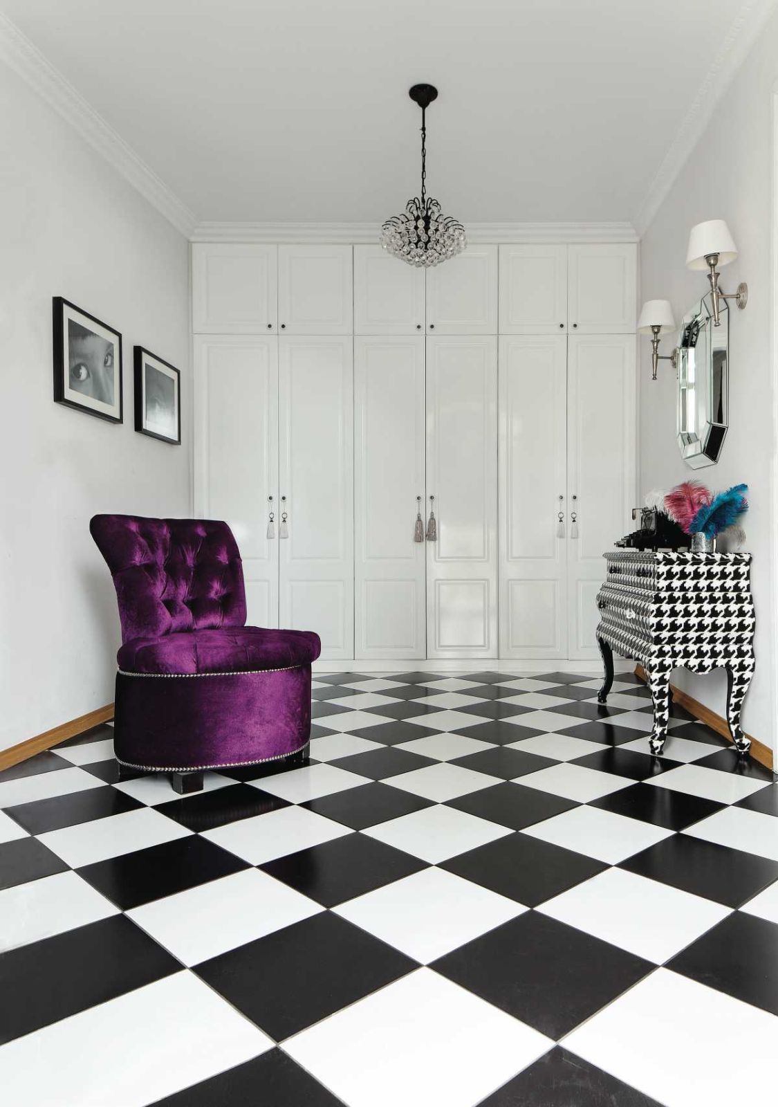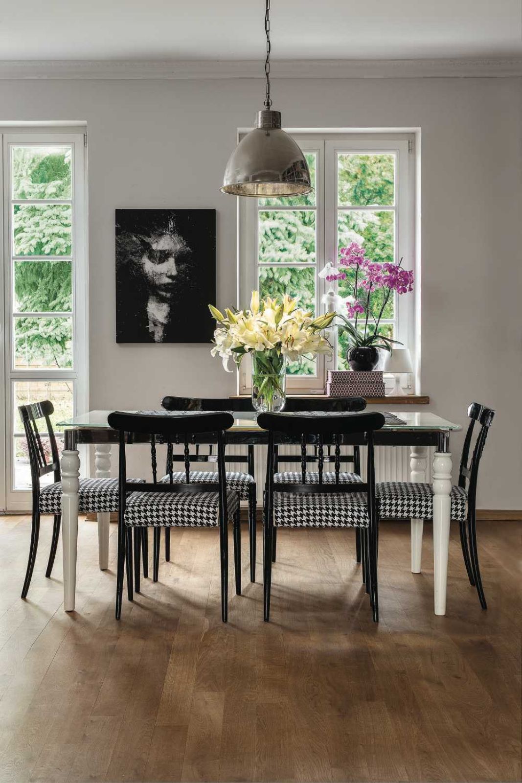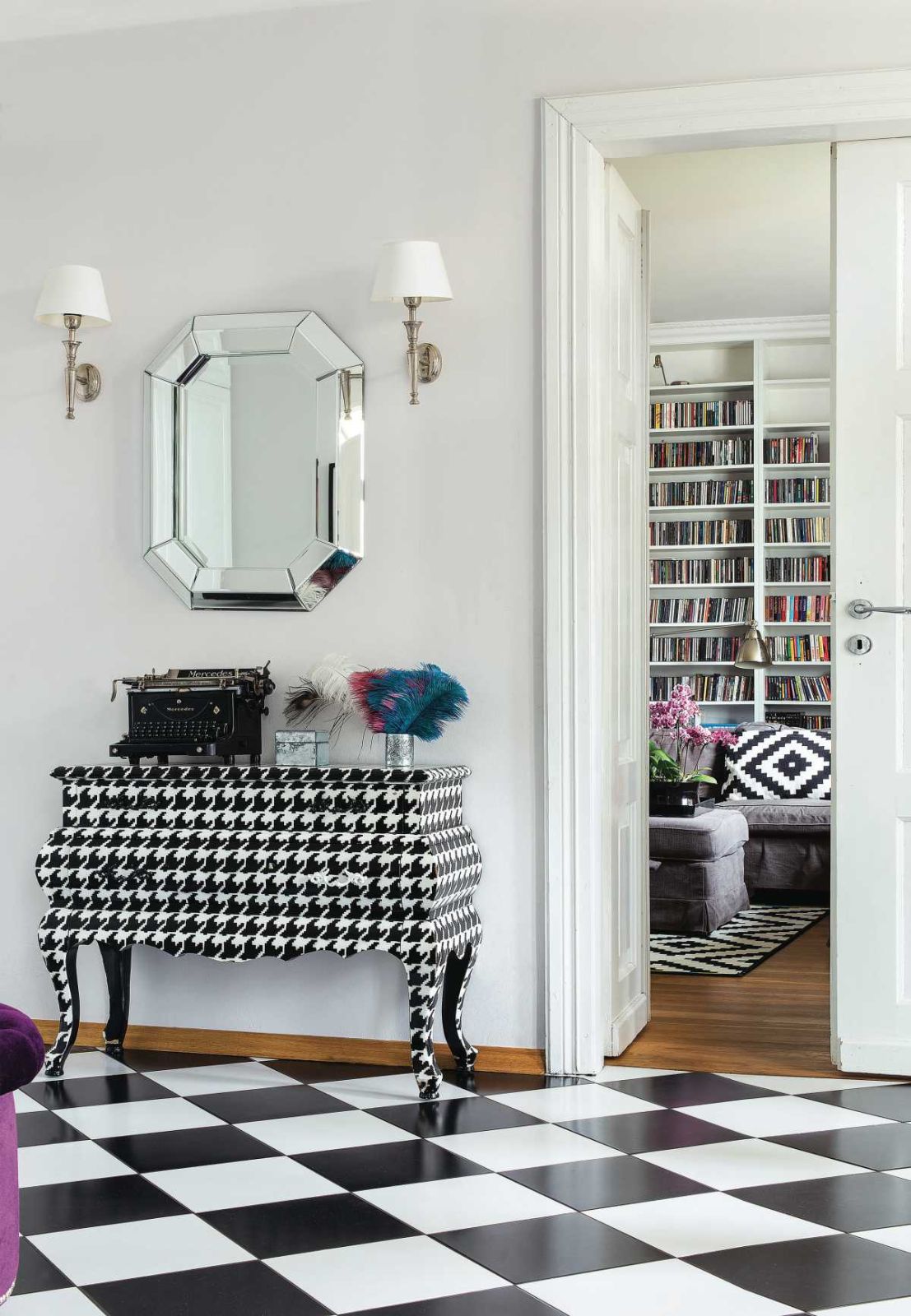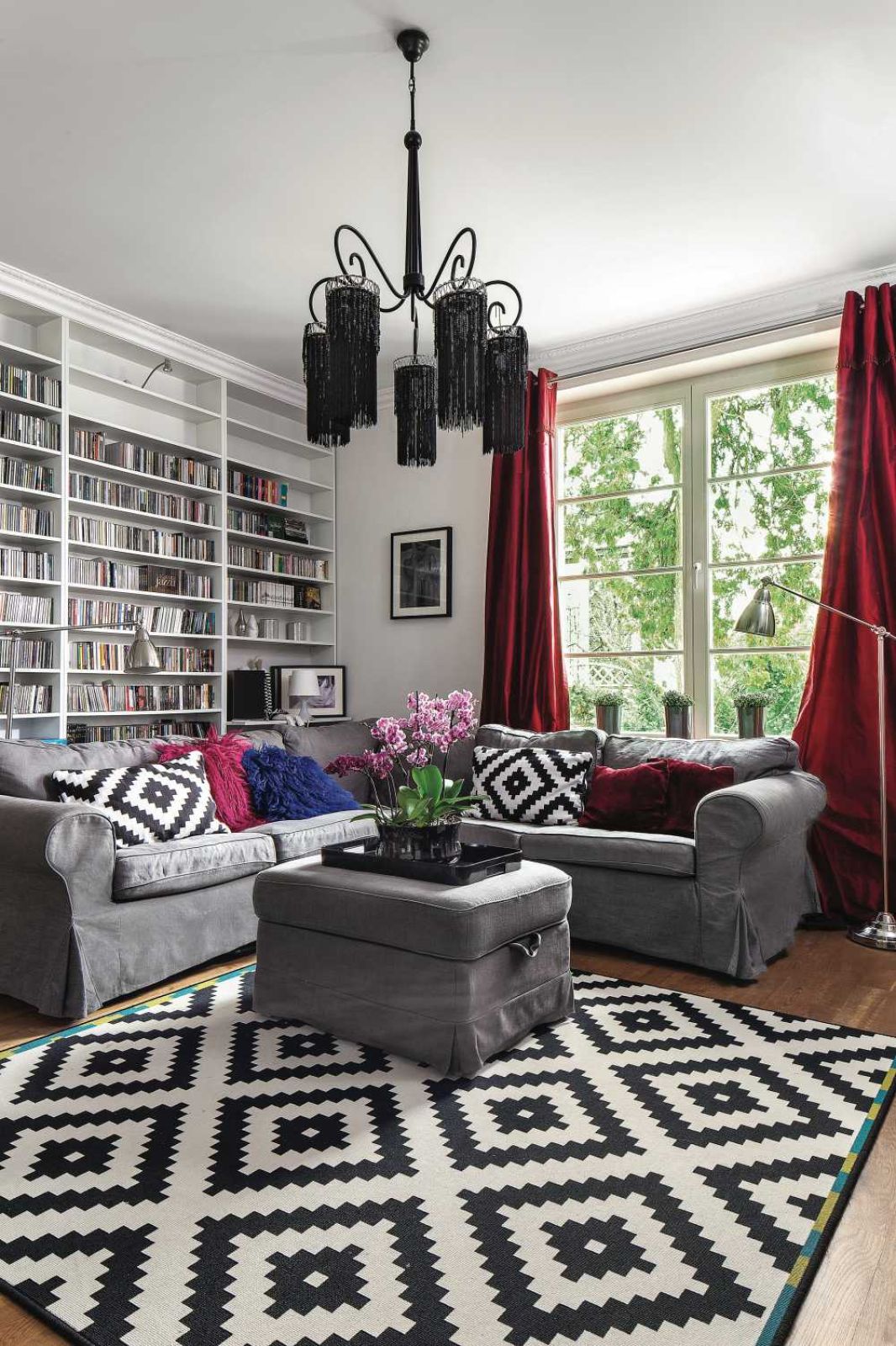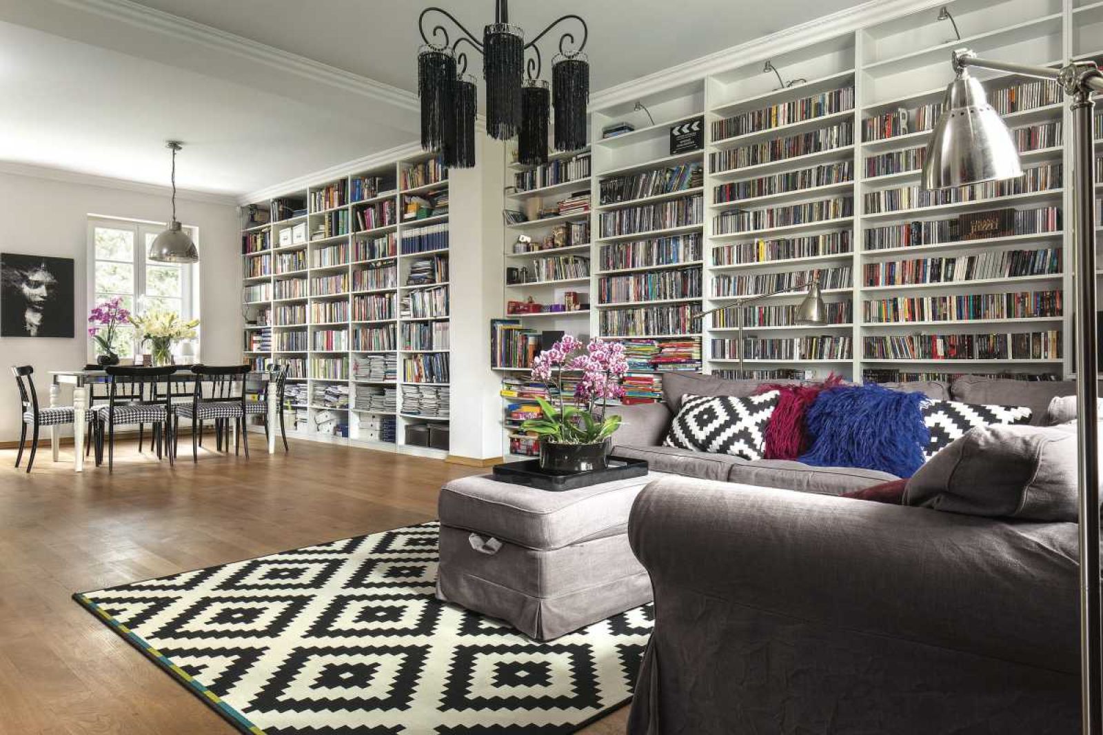 – Zawsze interesowałam się designem, czytałam magazyny i oglądałam programy telewizyjne – ostatnio towarzyszy mi w tym młodsza córka, którą zaraziłam pasją. Mąż dał mi wolną rękę, uzgodniliśmy tylko, że wnętrze ma być klasyczne, ponadczasowe, stąd wszechobecne czerń, biel i szarość, które dziesięć lat temu nie były tak powszechne. Wybierałam wszystko, począwszy od płytek w szachownicę, po kształt kominka. Ja kocham literaturę, a Piotr muzykę, więc cała ściana w salonie jest wypełniona książkami i płytami CD, które powoli zaczynają mieć wartość muzealną.