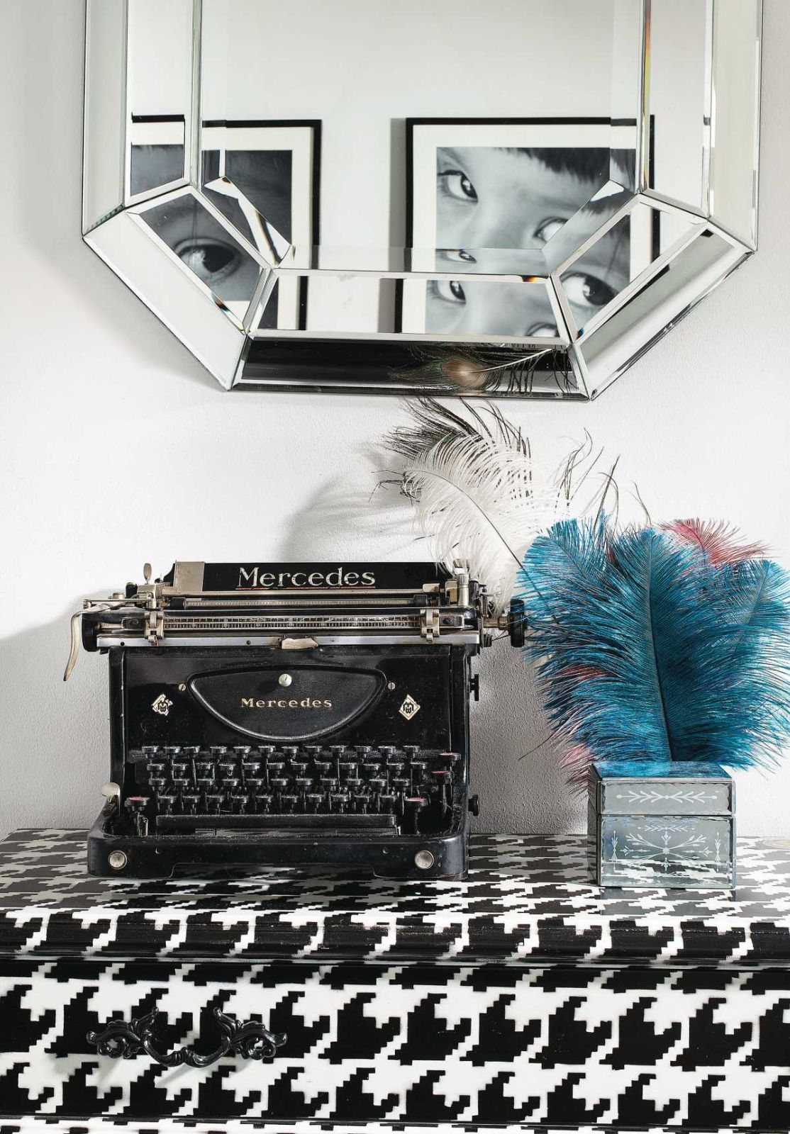 Meble kupowałam głównie w internecie – na Westwing, 9design i Live Beautifully – bo byłam wtedy na urlopie macierzyńskim i tak było najwygodniej. Miałam potworne wyrzuty sumienia z powodu bardzo drogiej komody Seletti, malowanej w klasyczną pepitkę, ale jest tak efektowna, że wydatek się opłacił. Stojąca na niej stara maszyna do pisania Mercedes jest jedynym „antykiem” w naszym domu – to pamiątka rodzinna Piotra, jego babcia pisała na niej wiersze. To też przypomnienie, że kiedyś bywał tu i tworzył Zygmunt Broniarek. Przez te wszystkie lata niewiele zmienialiśmy wystrój, poza pokojami dziewczynek, które szybko dorastają.