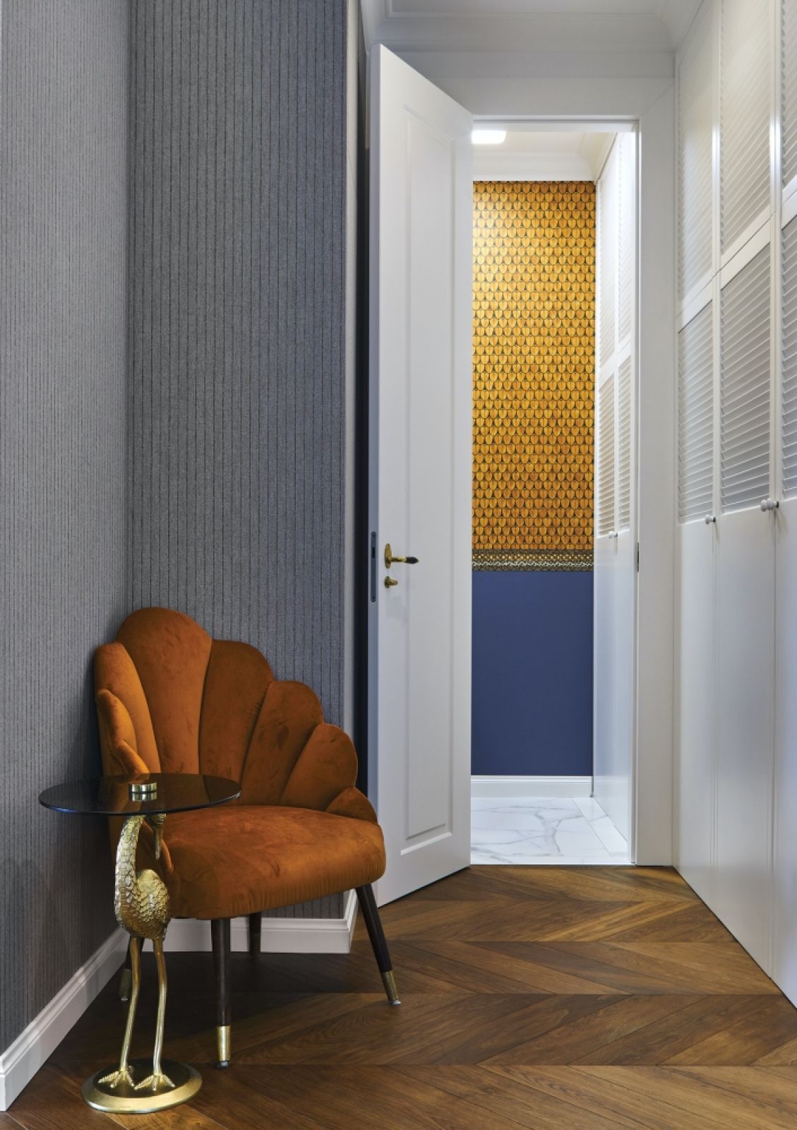Marzenia i pomysły przekuła w projekt Klaudia Wagner. – Stworzyłam amerykańskie wnętrze, ale z angielskimi wpływami. Tapety, tkaniny, którymi obito stylowe krzesła, zasłony to brytyjskie inspiracje – mówi projektantka. – Pomogły dopasować wnętrze do przyszarzonego niebieskiego, który nie jest łatwy w aranżacji. Ociepla go podłoga z dębu antycznego, ułożona w jodłę.