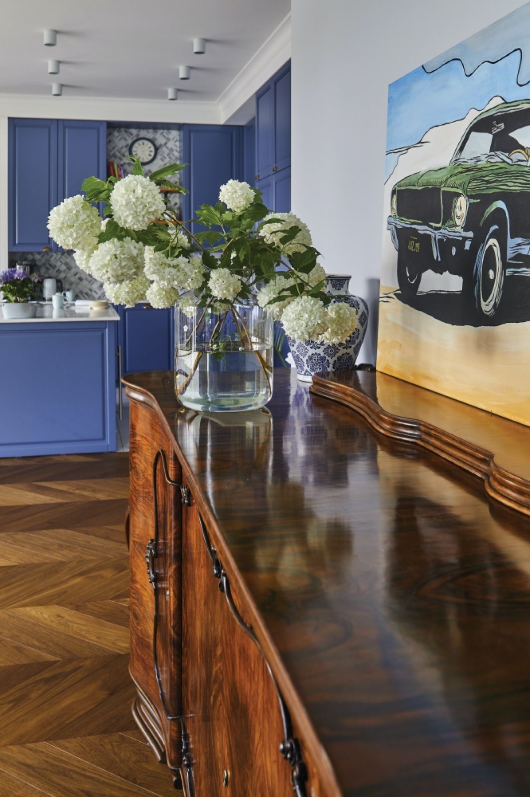We wnętrzu chcieli mieć dużo amerykańskich detali – od sztukaterii, przez charakterystyczne uchwyty muszelki w kuchennych szafkach, po złote akcenty. Oraz kolor niebieski, obowiązkowy w stylu nowojorskim i hamptons. Ale zmieścić się miał także komplet stuletnich mebli – stół z krzesłami i bufet, które w rodzinie Tomka przechodzą z pokolenia na pokolenie.