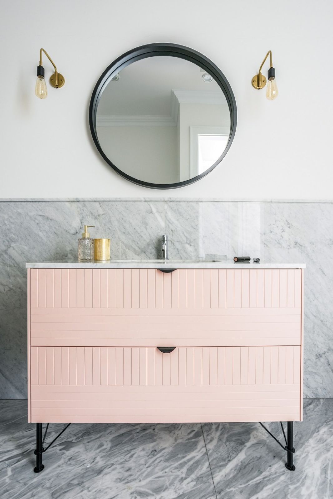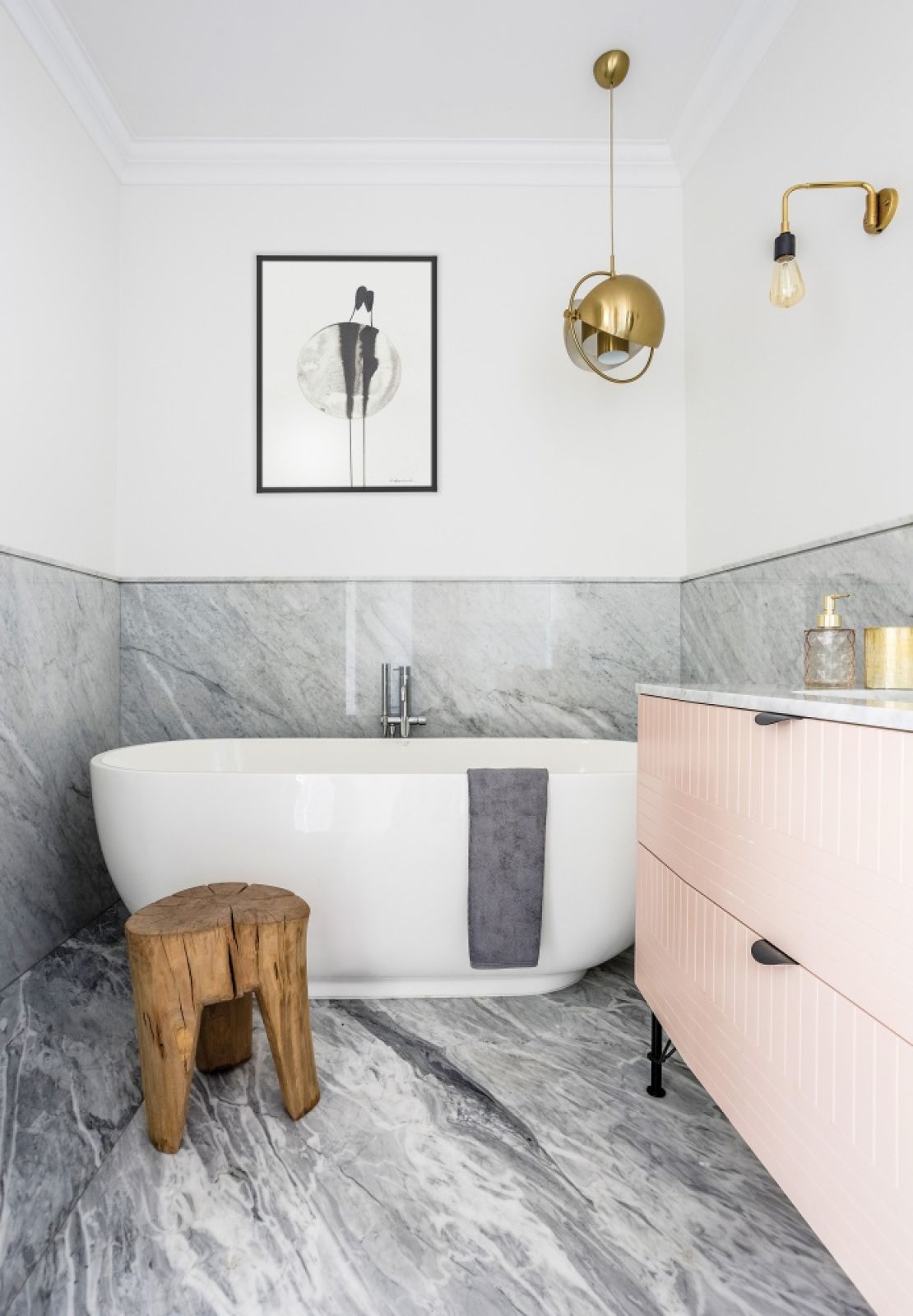 Marzenie Łukasza spełnił inny świetny rzemieślnik, specjalista od kamienia z firmy Stone Quintessential. Umywalkę z jednego marmurowego bloku żłobił przez dwa dni, a płytę ciętą z tego samego fragmentu dopasował tak, że żyłkowania płynnie przechodzą z obudowy misy na ścianę. To on w drugiej łazience zrobił marmurową podłogę, a do tego blaty i płyty na ścianę z eleganckim rantem. – Marmur to bardzo francuski akcent – mówi architektka. – Podobnie jak klasyczna dębowa podłoga ułożona w jodłę, wyraziste malowane kafle na posadzce w kuchni i przedsionku oraz delikatne sztukaterie na ścianach, a w korytarzu ciemne lamperie.