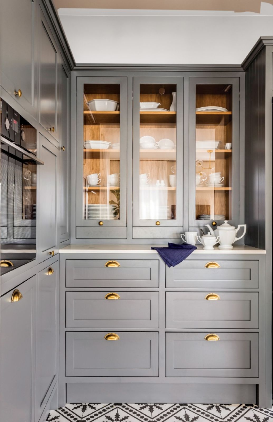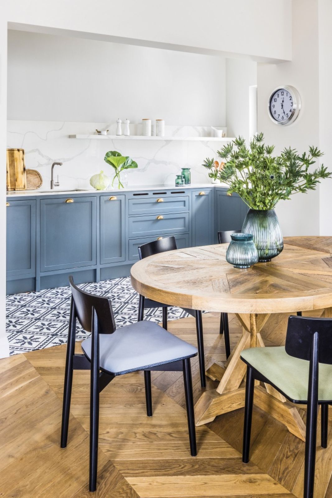 Jego dziełem jest także wymarzona kuchnia właścicielki, którą zaprojektowali architekci. Meble pomalowano taką farbą, która, zależnie od światła, ma kolor niebieski, szary albo zielony. – Klienci nie chcieli typowych górnych szafek – mówi Kasprzyk-Olszewska. – W części kuchni są więc tylko te dolne i otwarta kamienna półka. Z kolei we wnęce stoi szafa od podłogi do sufitu z wbudowanym piekarnikiem i witryna zaprojektowana specjalnie dla słynnego serwisu Biała Maria Rosenthala – prezentu ślubnego.