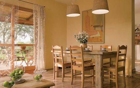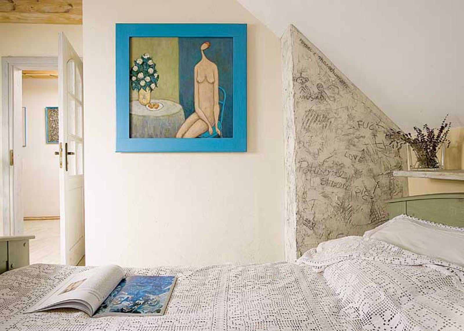 W ten sposób powstała dekoracyjna „przecierka”, motyw przewodni w całym domu. Sypialnia także ma indywidualny rys – fragment odartej do gołego tynku ściany, na której znalazło się rodzinne graffiti. Wyznania miłości, dosadne przekleństwa i rysunki to zapis chwili – cała rodzina dodała tu coś od siebie.