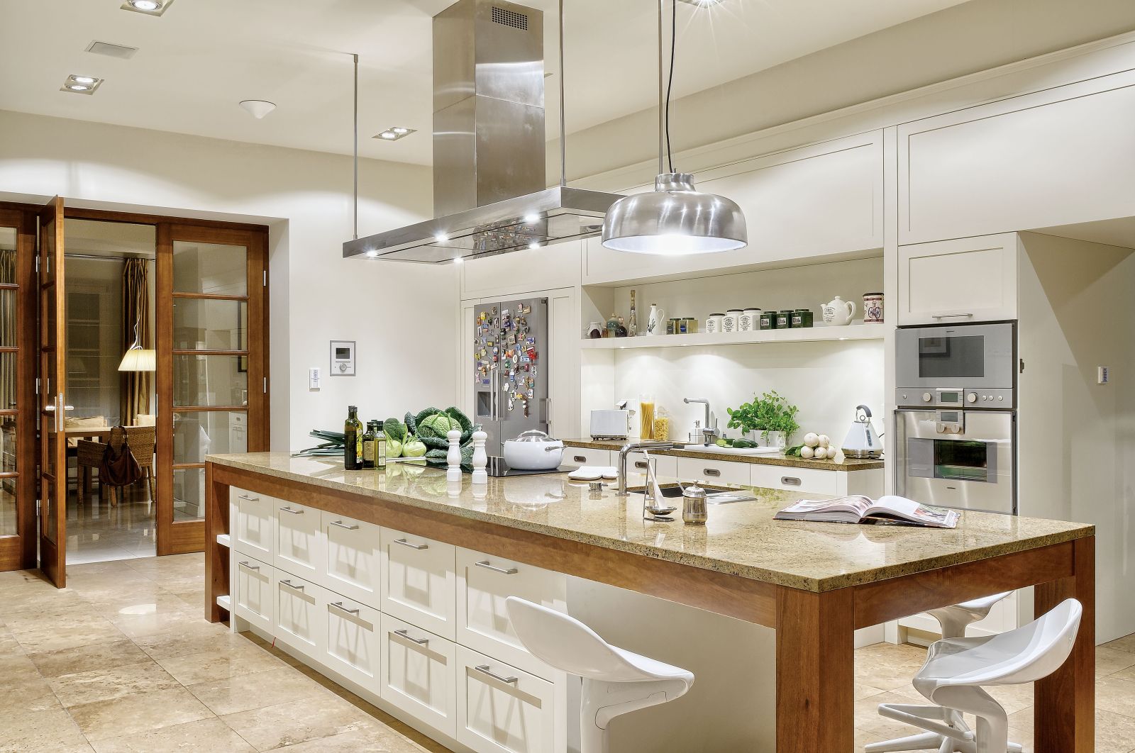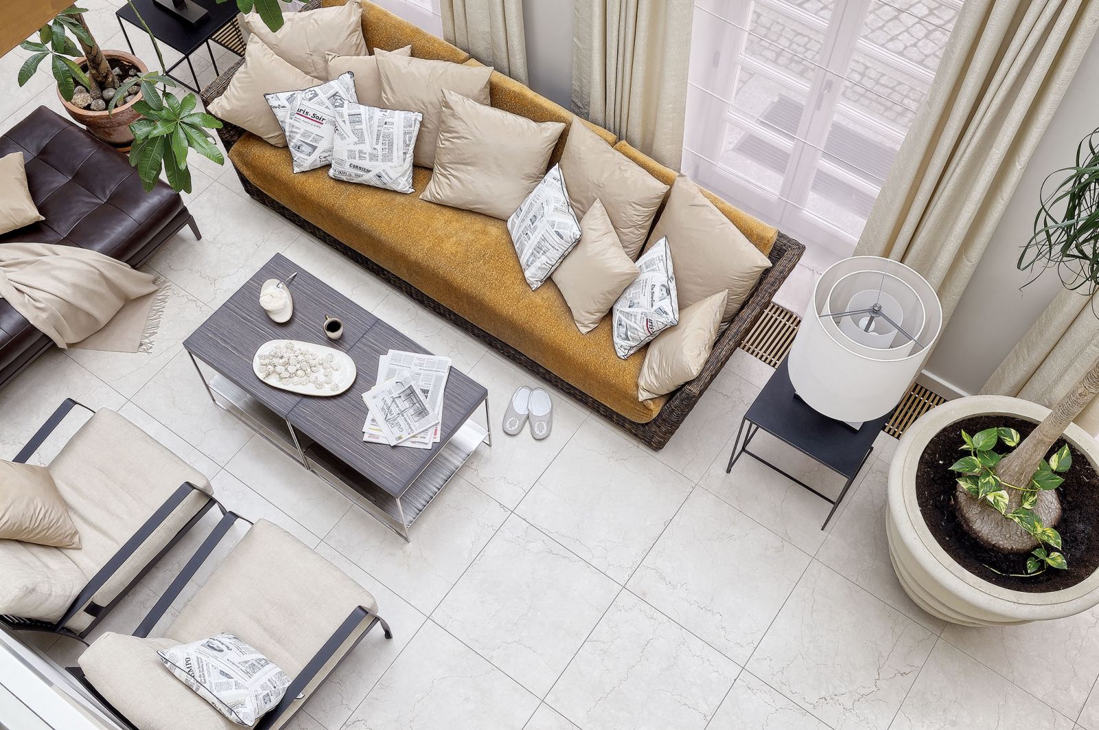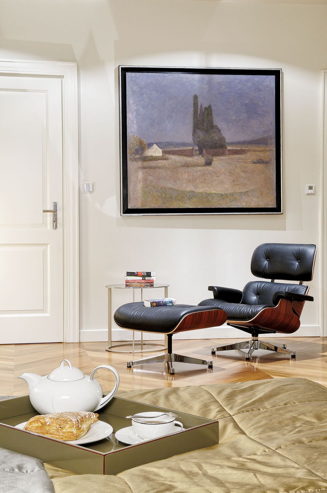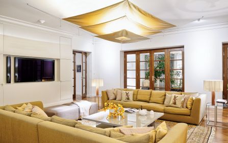 Gdyby nie typowo polska pogoda, można by mieć wrażenie, że siedzimy w najprawdziwszym palazzo. Za oknem platany i krzewy różane otoczone bukszpanami. Wokół współczesna klasyka, czyli głównie włoszczyzna: Minotti, Gervasoni, Zanotta. Nie gryzie się z tą ponadstuletnią, też zresztą włoską. Gdzieniegdzie, jakby od niechcenia, stoją prawdziwe dizajnerskie perełki: a to lampa Castiglioniego na marmurowym postumencie, a to posągowe sofy Paoli Navone.