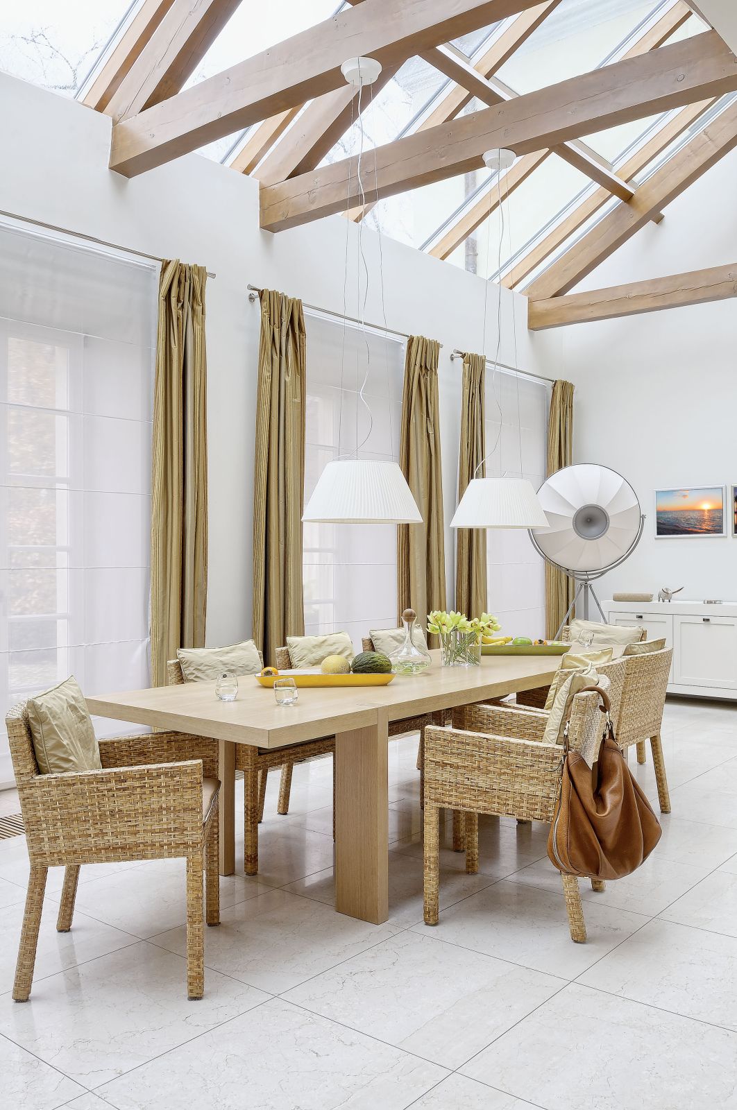 – Dom jest ogromny, szukałam pomysłu, żeby żył, a nie był tylko gmachem reprezentacyjnym – opowiada. – To zadanie spełniło oświetlenie. Stworzyłam całe sterowane pilotem sceny świetlne tworzące klimat rozmaitych wnętrz. Jest tu około stu lamp, załączanie każdej z osobna oznaczałoby, że większość nigdy by nie zaświeciła. Byłoby szkoda, bo poza moim ukochanym Ingiem Maurerem są tu same dizajnerskie hity od Flosa, Moooi, Bovera czy Marseta. Na koniec do całości dobrałam tkaniny – dwa kilometry jedwabi, wiskozy i bawełny. Szyła je według mojego projektu pani Sława Chmurko. Można by nimi z powodzeniem obdzielić kilka rezydencji. Swoje robi też winda. Skraca dystans między kinem, spa na drugim piętrze a winiarnią w piwnicy. Dzięki niej w tym olbrzymim domu wszędzie jest blisko.