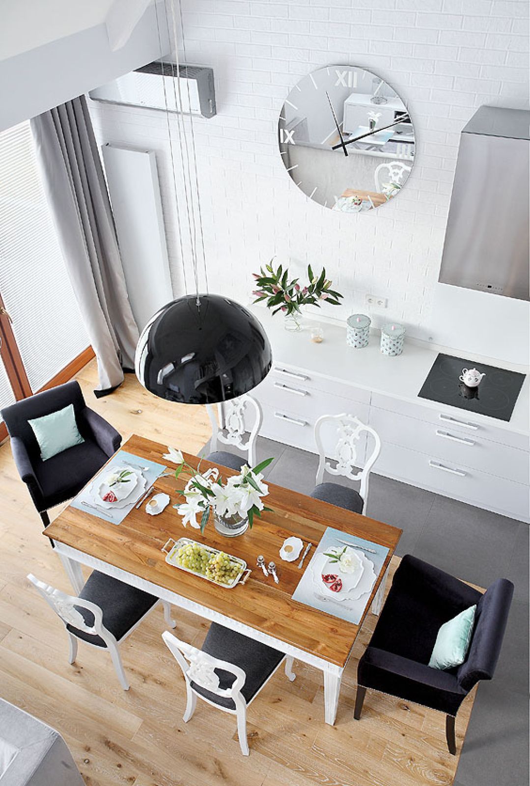 – Ubieram się dość kolorowo, ale domy wolę monochromatyczne. Wybrałyśmy złamane szarości. Odpowiednio do pory roku bawię się teraz różnymi ich odcieniami: na przykład latem wieszam zasłony błękitne, zimą ciemnoszare, na święta podobne, ale zdobione cekinami – mówi Magda. W gołębim kolorze są też szafki w kuchni z Decor Living Home. Ciekawie wyglądają na tle białej ceglanej ściany – tak naprawdę zrobiono ją z cienkich nakładek, które cegłę imitują. – Ściana wyszła wspaniale, ale jest wysoka na sześć metrów, więc wiało pustką. Zaczęłyśmy szukać czegoś, co można by na niej powiesić. Duży okap – to za mało. Wypatrzyłyśmy zegar – kosztował majątek. Patrycja nie dała jednak za wygraną i zaprojektowała podobny: u szklarza wykroiłyśmy koło o średnicy prawie półtora metra, przymocowałyśmy wskazówki i gotowe – wspomina Magda.