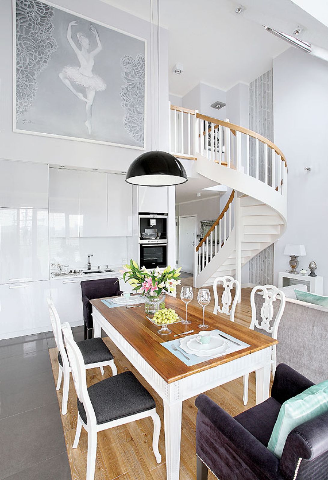 A baletnica? – To było tak: golizną straszyła jeszcze ściana w kuchni, więc asystentka Patrycji, studentka ASP, zaproponowała, że namaluje obraz. Dałyśmy jej wolną rękę, ale gdy wśród propozycji pojawiła się tancerka, sprawa była przesądzona. Moja córka Natasza ćwiczy balet, więc bez chwili namysłu krzyknęła: „Mamo, bierzemy!”, i wielkie płótno – dziewczyna ma 170 centymetrów wzrostu – wjechało przez okno do mieszkania.