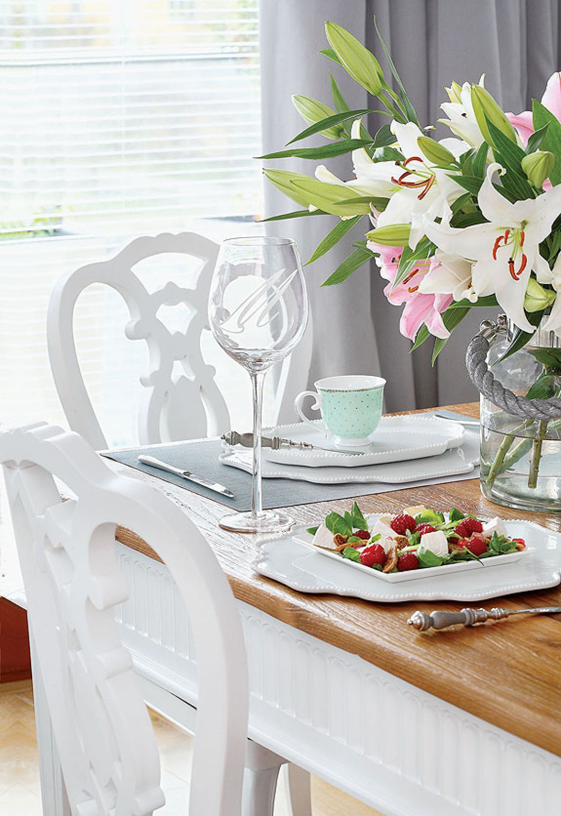 Większość mebli zrobili na zamówienie stolarze współpracujący z Galerią Decor, a story, obicia czy podkładki pod talerze – zaprzyjaźniona pracownia krawiecka. Brakowało tylko kropki nad i. Z pomocą przyszła firma Bois & Charme, w której kupiły ozdobę jadalni – stół, ową szczyptę południowej Francji, która nadaje wnętrzu nieco rustykalny charakter.