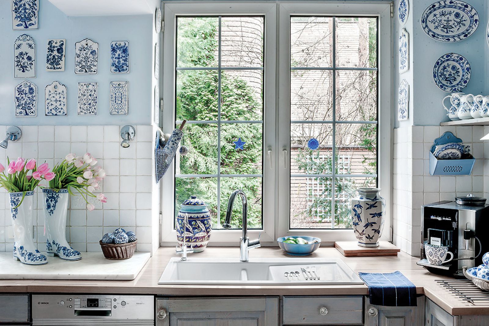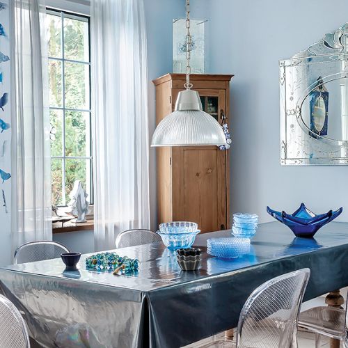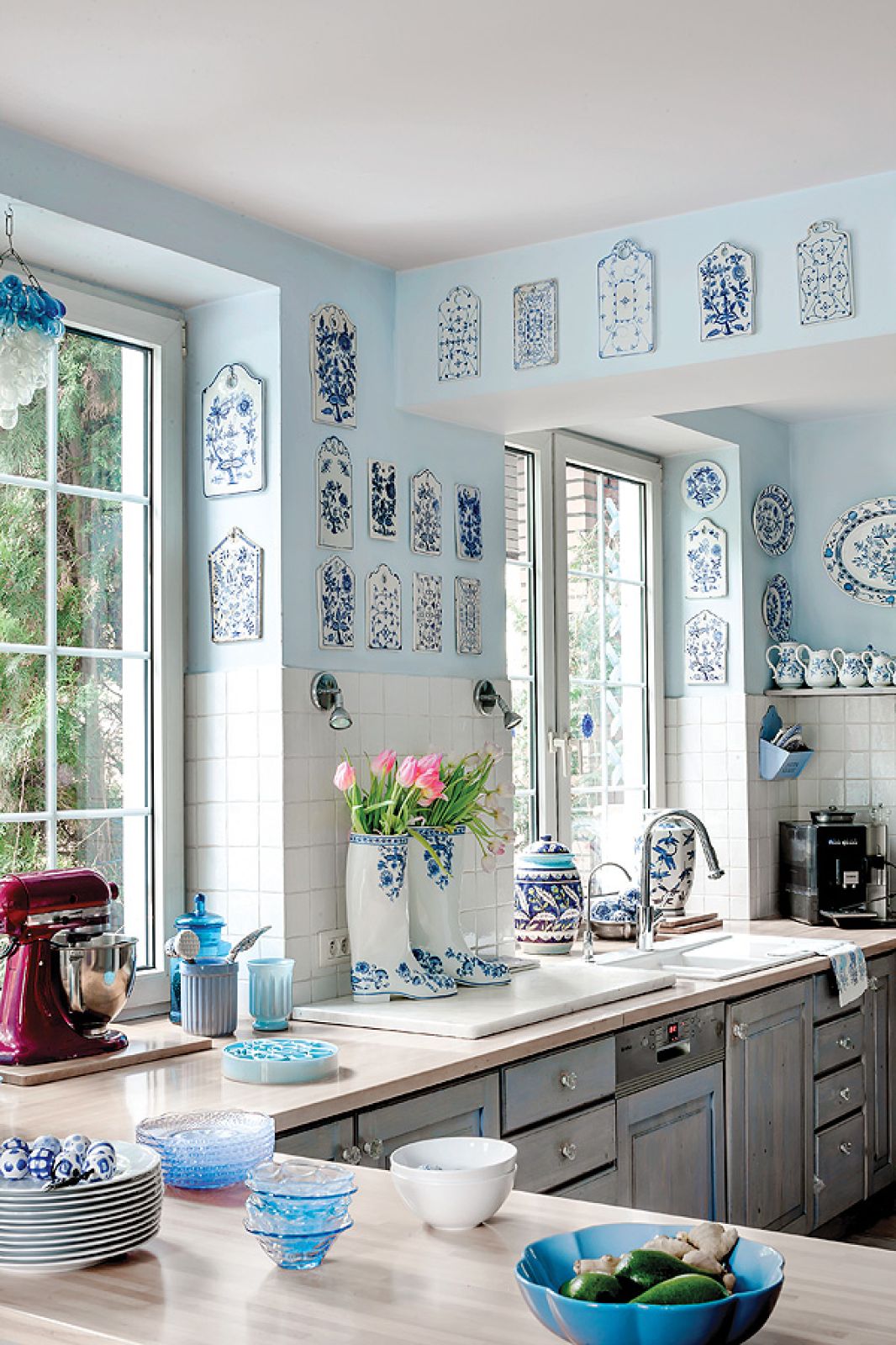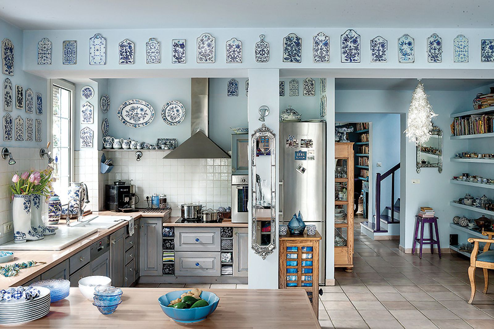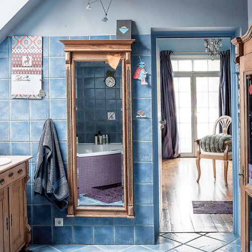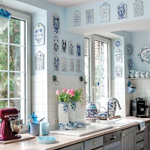 – Z myślą o tej kolekcji powstał nasz dom, oczywiście niebieski – tłumaczy Agnieszka. Pod kolor zrobili ściany i przecierane szafki w kuchni. Niebieski jest też kominek. – Kiedyś dostaliśmy od rodziców cztery kafle z Tunezji. Pomyśleliśmy, że ładnie wyglądałyby przy palenisku, ale było ich za mało. Tak długo szukaliśmy po całym Tunisie, aż wreszcie znaleźliśmy takie, które pasują – opowiada Agnieszka.