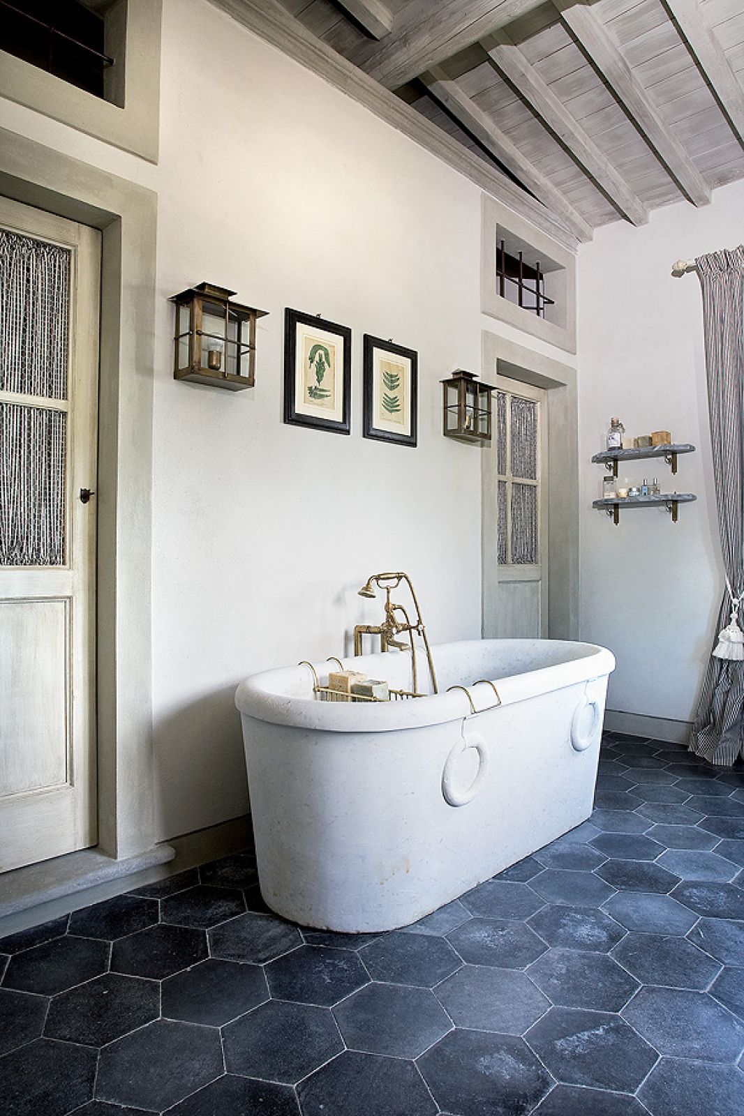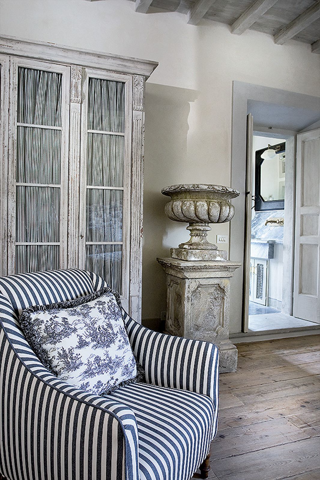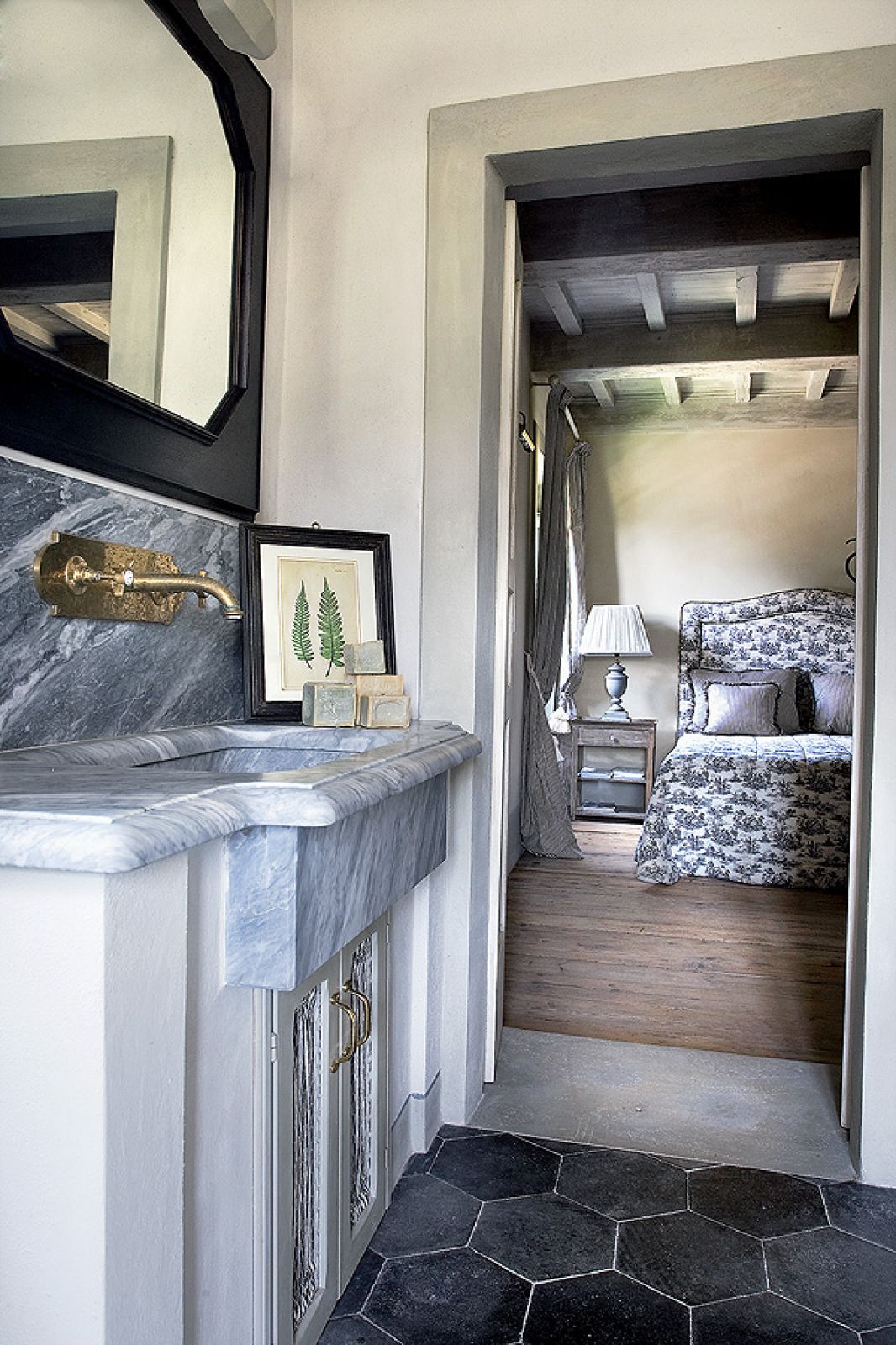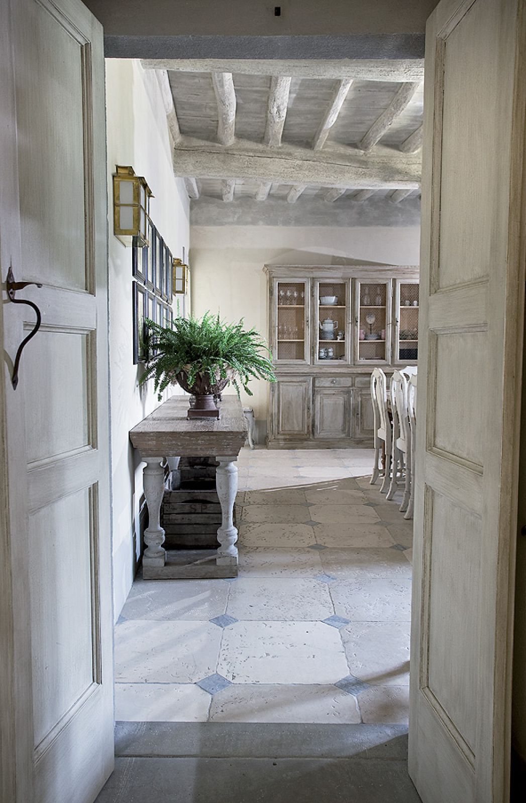 Massimo, mocny w zieleni, z wnętrzami postanowił nie ryzykować, ale zdać się na profesjonalistę. Wybrał Antonia Lionettiego, który zaczynał od prowadzenia antykwariatu, a dziś jest rozchwytywanym projektantem domów w stylu country chic. Łatwo się domyślić, w jakim poszedł kierunku. Kolory Toskanii: zieleń w odcieniu szałwii, szarości, sjena palona. Odsłonięte belki na suficie, postarzane dechy, kamienne umywalki i oskrobane drzwi. Meble – z antykwariatu Antonia na via Santo Spirito we Florencji. Do tego rustykalne stoły.