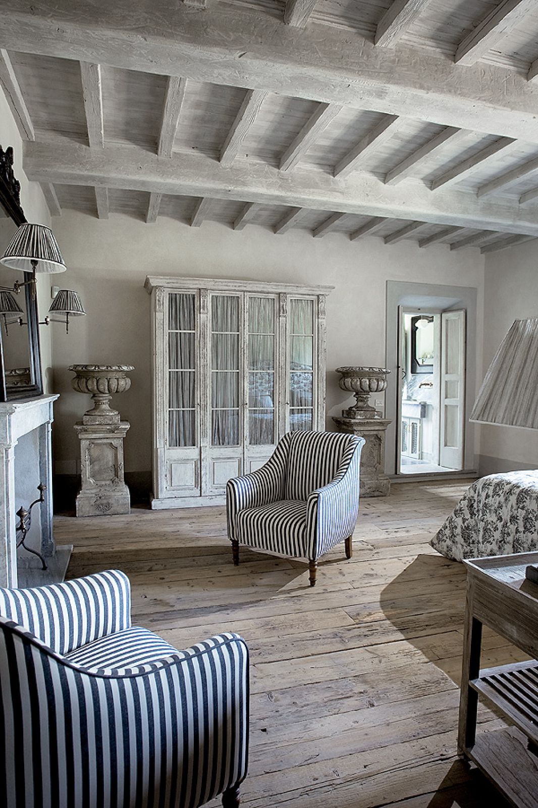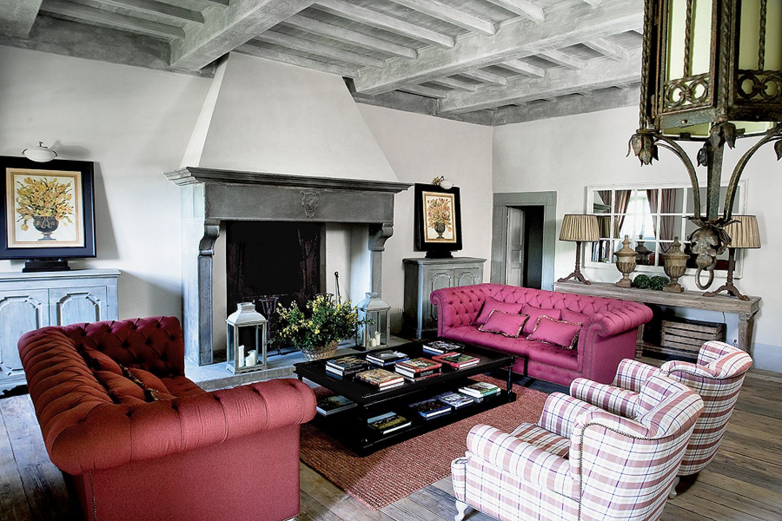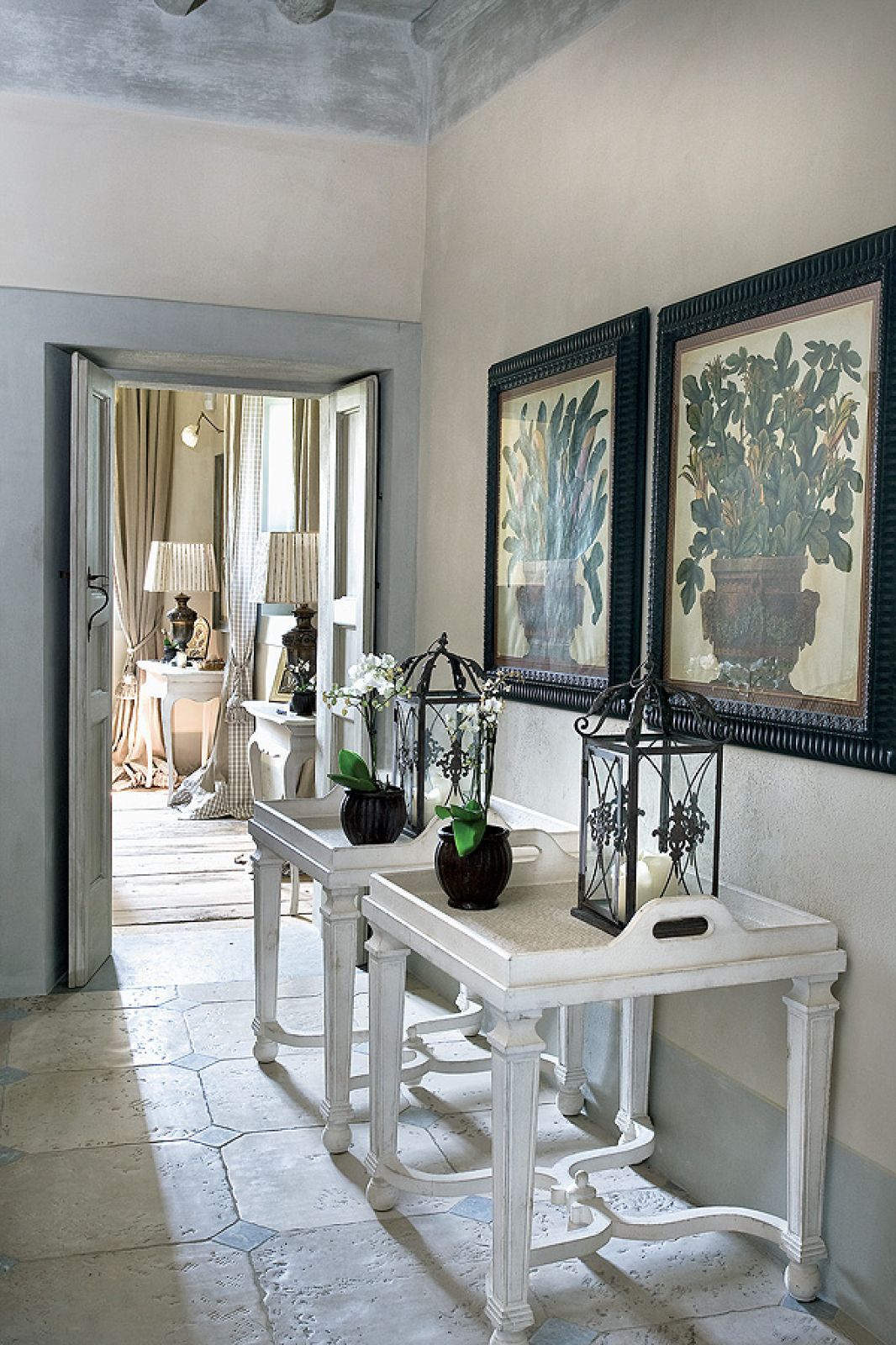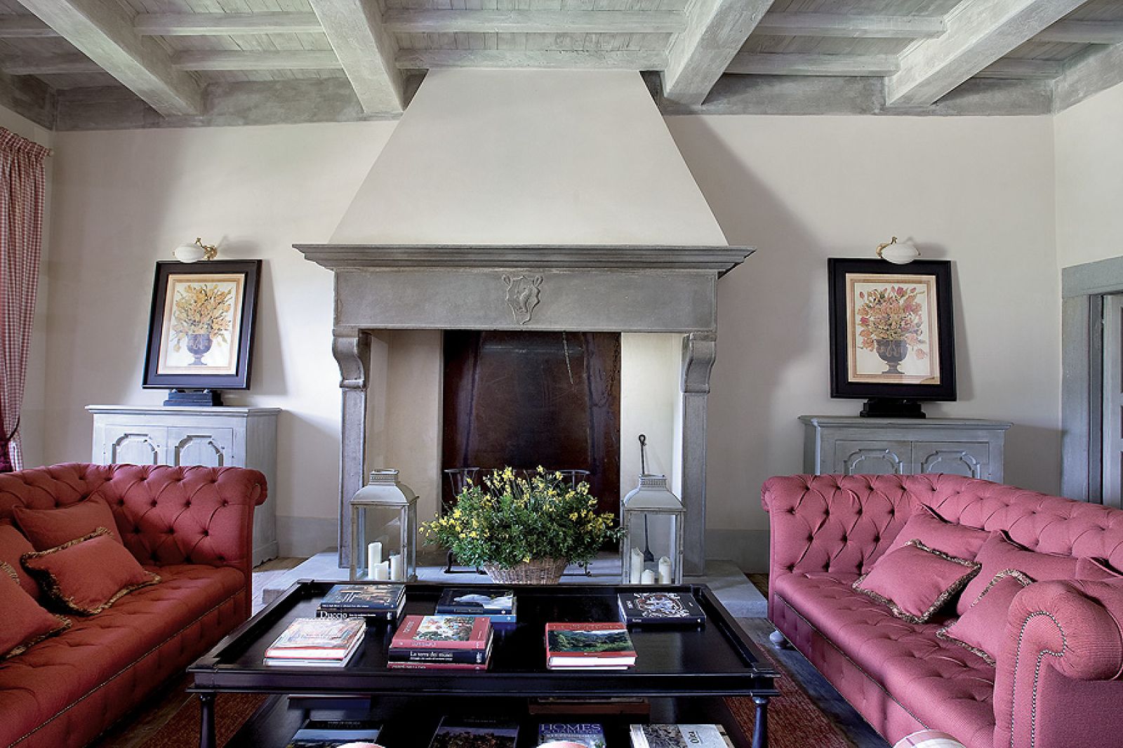 Massimo, mocny w zieleni, z wnętrzami postanowił nie ryzykować, ale zdać się na profesjonalistę. Wybrał Antonia Lionettiego, który zaczynał od prowadzenia antykwariatu, a dziś jest rozchwytywanym projektantem domów w stylu country chic. Łatwo się domyślić, w jakim poszedł kierunku. Kolory Toskanii: zieleń w odcieniu szałwii, szarości, sjena palona. Odsłonięte belki na suficie, postarzane dechy, kamienne umywalki i oskrobane drzwi. Meble – z antykwariatu Antonia na via Santo Spirito we Florencji. Do tego rustykalne stoły.