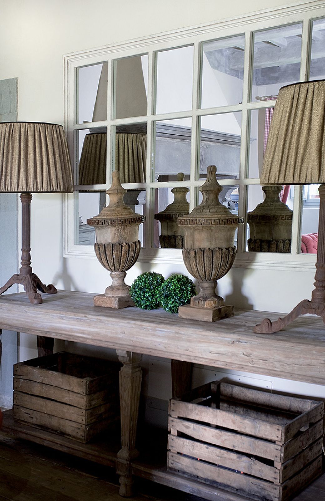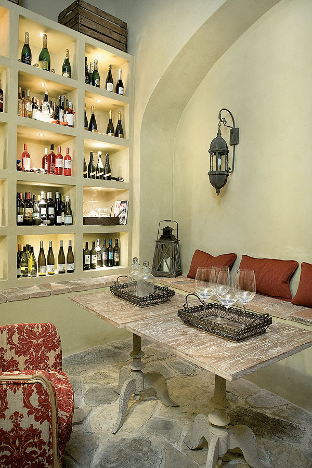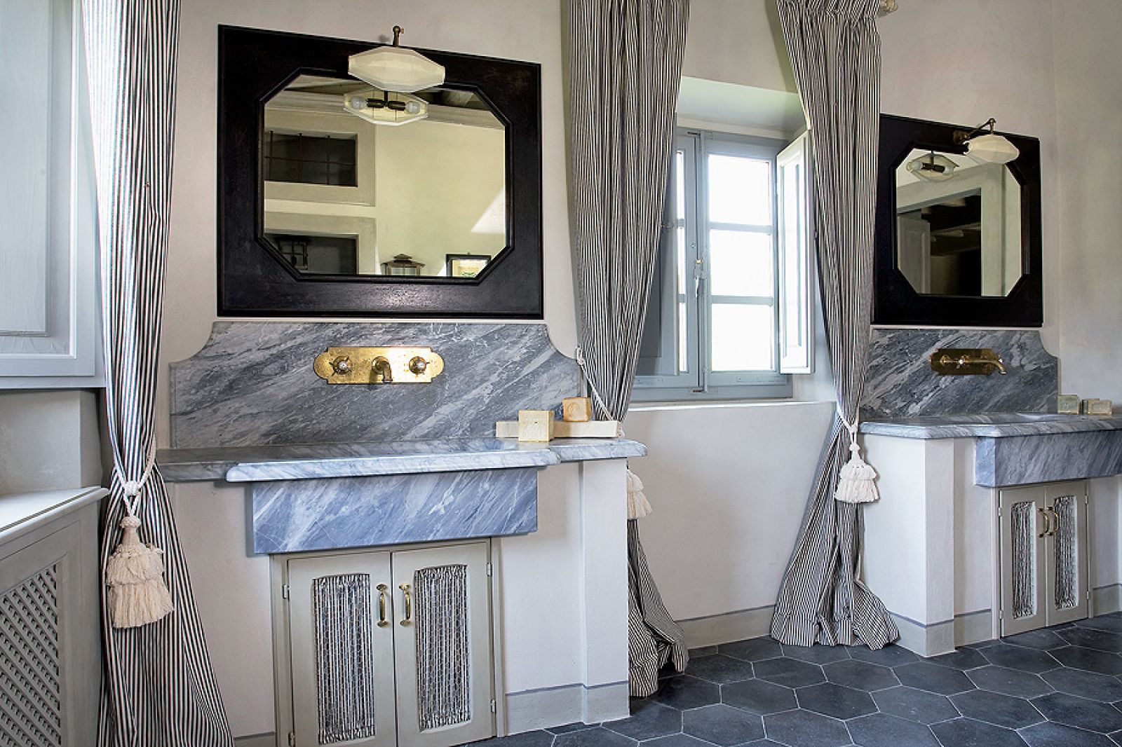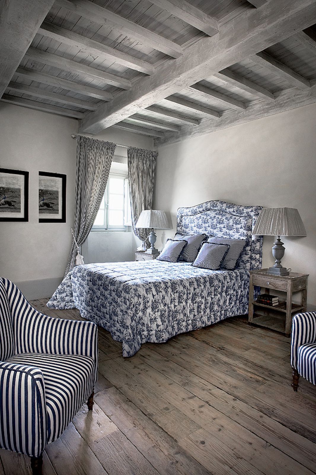 Massimo, mocny w zieleni, z wnętrzami postanowił nie ryzykować, ale zdać się na profesjonalistę. Wybrał Antonia Lionettiego, który zaczynał od prowadzenia antykwariatu, a dziś jest rozchwytywanym projektantem domów w stylu country chic. Łatwo się domyślić, w jakim poszedł kierunku. Kolory Toskanii: zieleń w odcieniu szałwii, szarości, sjena palona. Odsłonięte belki na suficie, postarzane dechy, kamienne umywalki i oskrobane drzwi. Meble – z antykwariatu Antonia na via Santo Spirito we Florencji. Do tego rustykalne stoły.