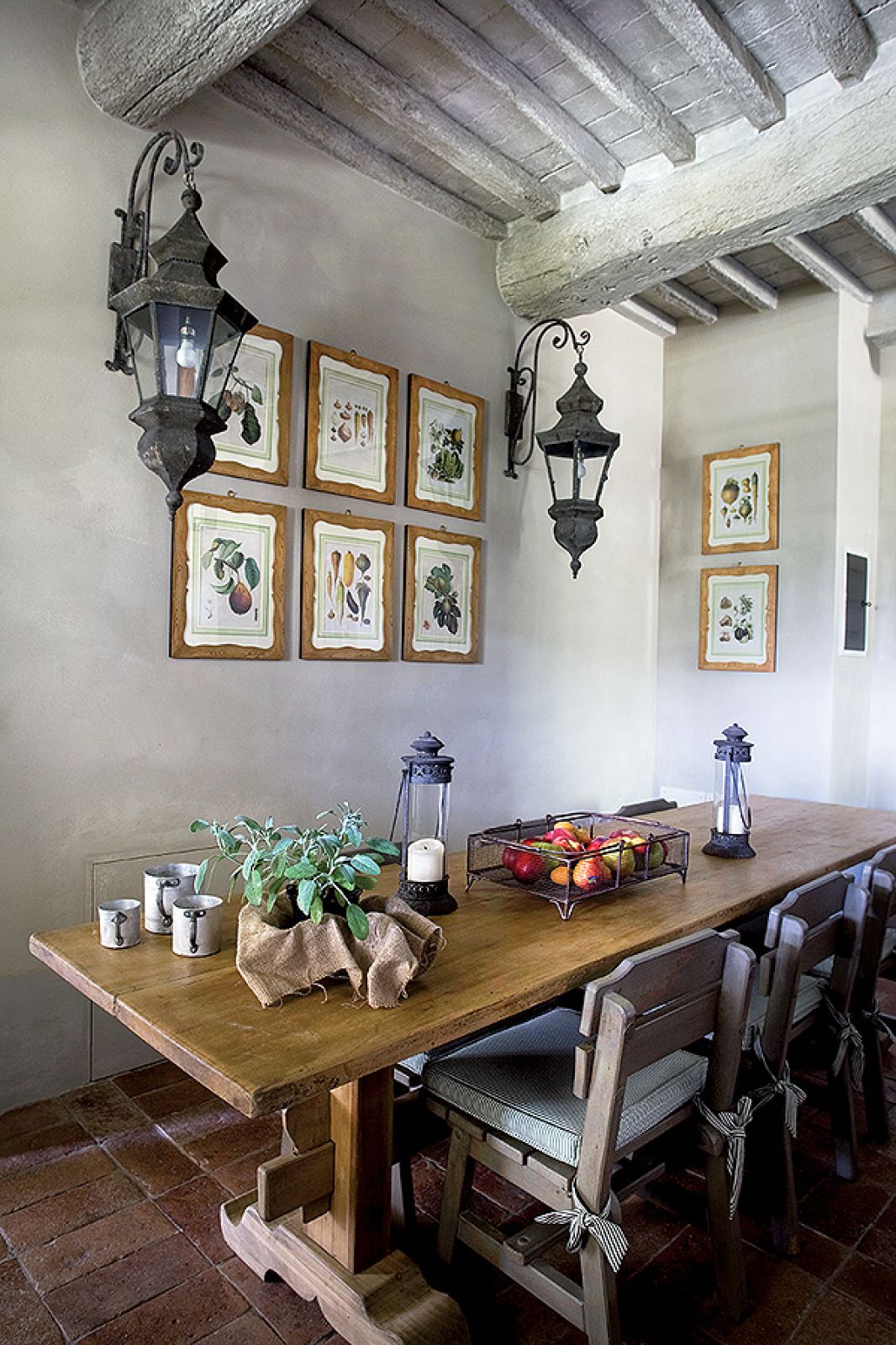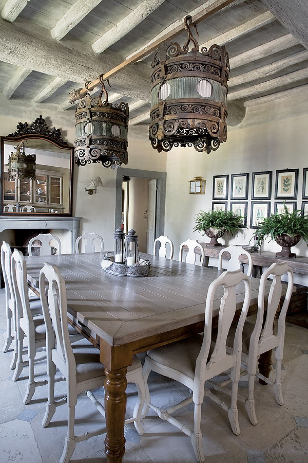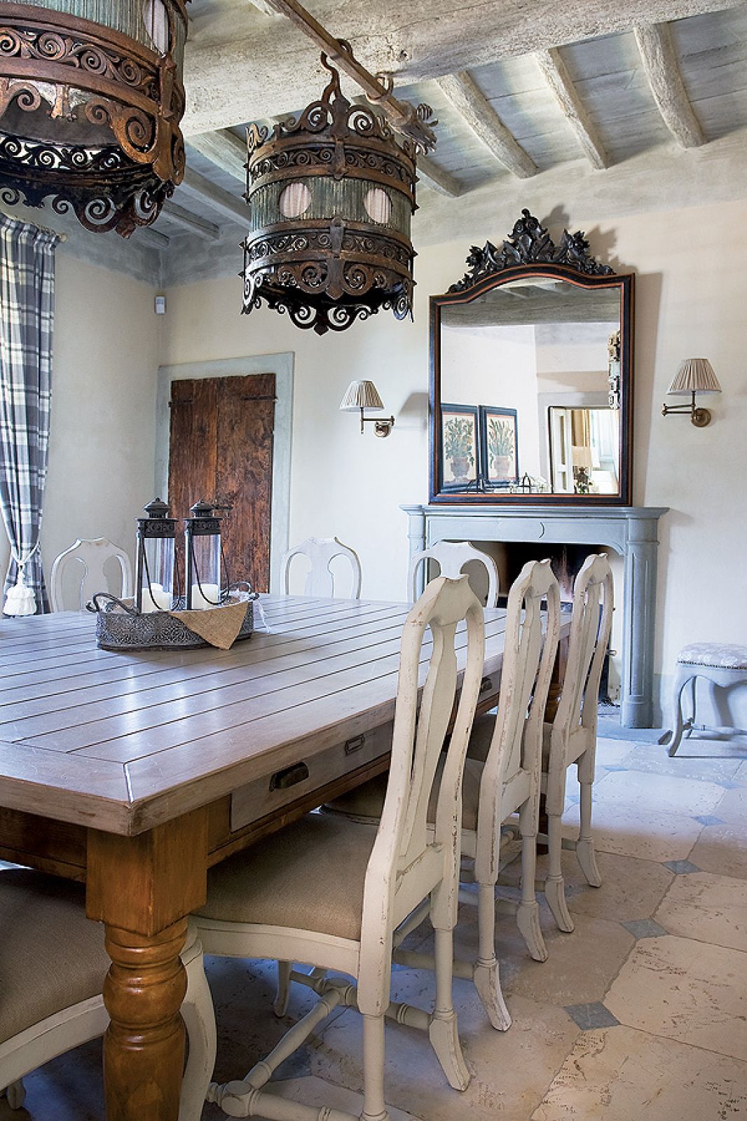 Mnóstwo stołów (w domu są cztery jadalnie). Przy tym w kuchni (na dziesięć osób) domownicy jedzą śniadanie; ten pobielany z pałacowymi krzesłami przeznaczony jest na niedzielne obiady; ogromny kwadratowy, ustawiony pod majestatycznymi miedzianymi lampami, łączy całą rodzinę w święta; a przy stole na toczonych mosiężnych nogach smakuje się toskańskie wina, leżakujące tuż obok na półkach.
