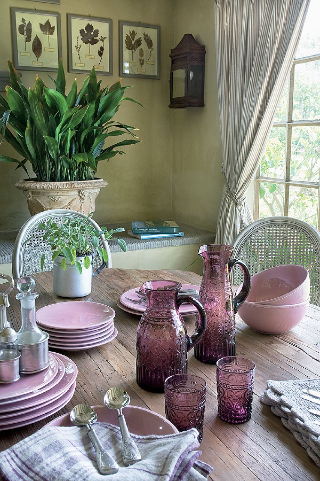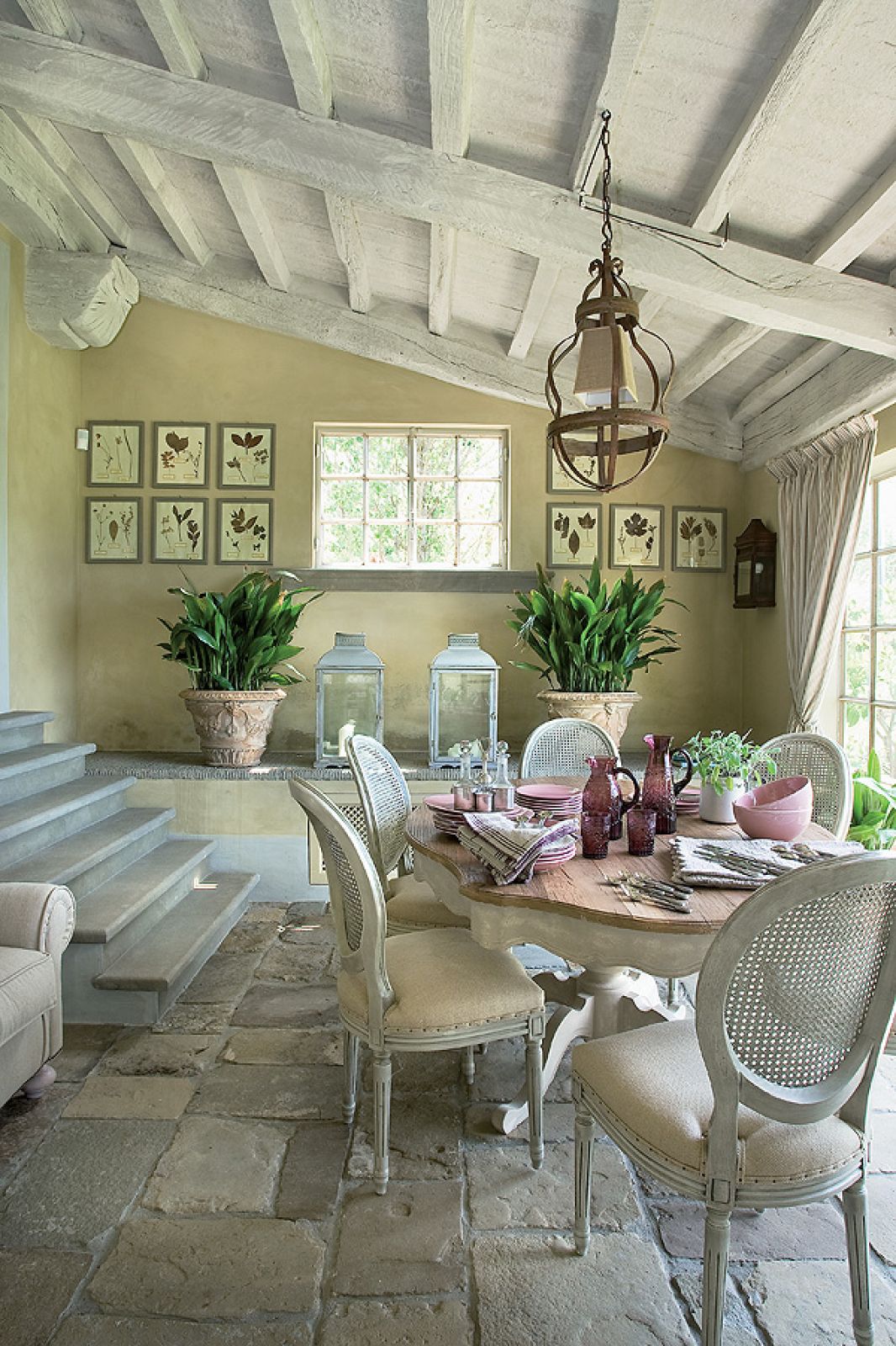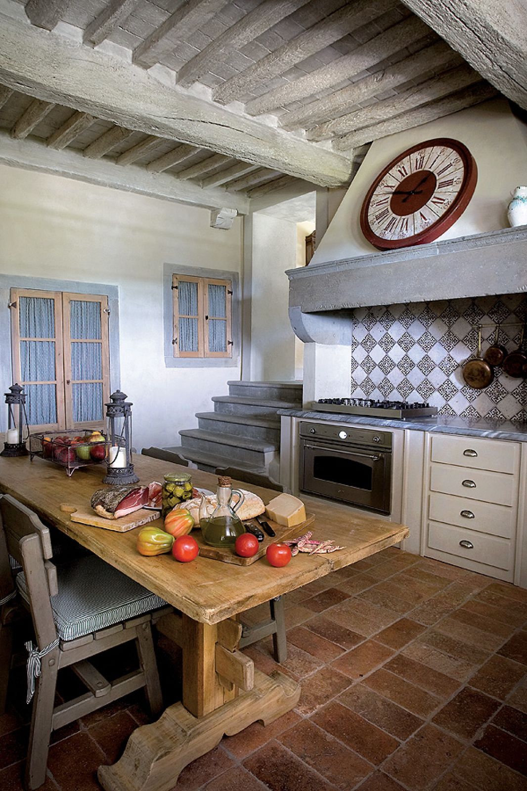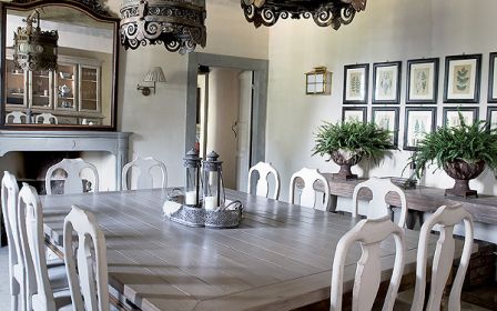 Mnóstwo stołów (w domu są cztery jadalnie). Przy tym w kuchni (na dziesięć osób) domownicy jedzą śniadanie; ten pobielany z pałacowymi krzesłami przeznaczony jest na niedzielne obiady; ogromny kwadratowy, ustawiony pod majestatycznymi miedzianymi lampami, łączy całą rodzinę w święta; a przy stole na toczonych mosiężnych nogach smakuje się toskańskie wina, leżakujące tuż obok na półkach.