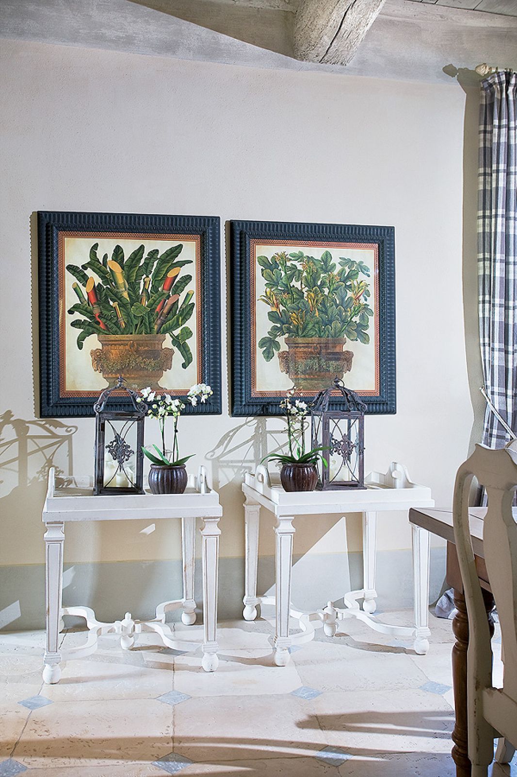 Massimo chyba lubi, gdy dużo się dzieje. Prawie wszystkie meble i dodatki występują w parach: stoliki, konsole, lampy, antyczne amfory i wazony. Ale najwięcej jest u Menichellich obrazów przedstawiających zioła i warzywa: wiszą w kuchni, w korytarzu, w oranżerii i salonie. – Część ogrodu, czyli taras z widokiem na toskańskie wzgórza, przeznaczyliśmy na grządki z bazylią, rukolą, sałatami, koprem włoskim. Te obrazki to takie przedłużenie zapachów i smaków z naszego ogrodu.