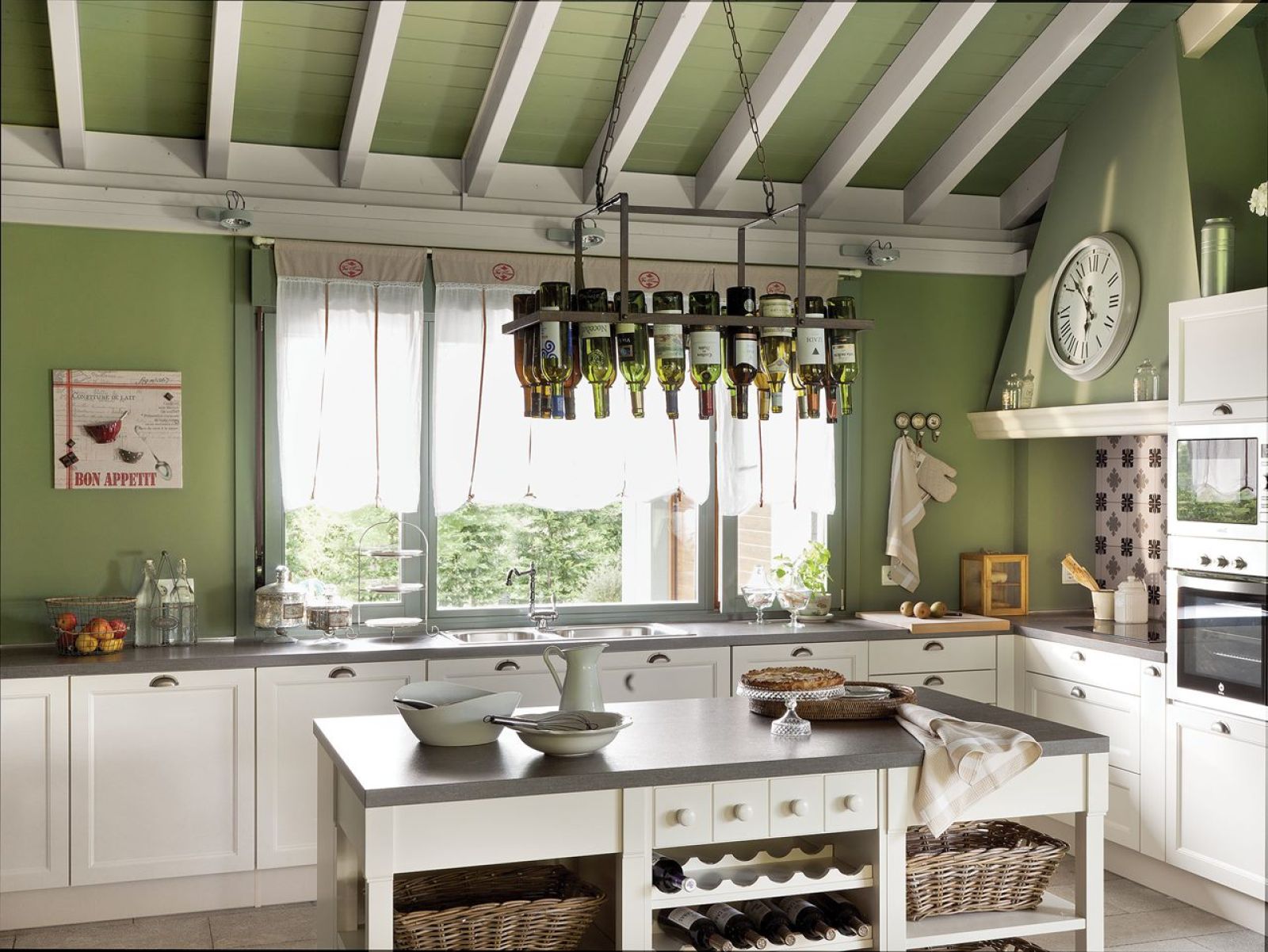 Architekci zlikwidowali sufit nad kuchnią i jadalnią, odsłaniając malownicze belkowanie. Zaproponowali też kolory – na parterze stonowaną zieleń z dodatkiem kości słoniowej, na piętrze odwrotny układ. Pomalowane w taki sposób ściany sprawiają wrażenie bardzo graficznych, a styl rustykalny nabrał świeżości. Intrygująco wyglądają zielone okiennice i elewacja w tym samym kolorze. Na dachu natomiast położyli różnokolorowe dachówki.