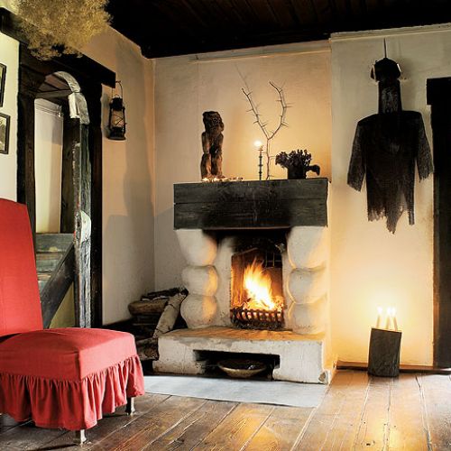 W salonie czerwień pojawia się na „szacie” fotela przy starym kominku zaprojektowanym przez artystę. To pan Henryk wpadł na pomysł, by ozdobić go okrągłymi kolumnami i ulepił je z gliny. Codzienny rytuał rozniecania ognia należy do żony Anieli, jednak to on zawsze przed posiłkiem zapala stojącą na kominku świecę. Taka tradycja, którą uwielbiają.