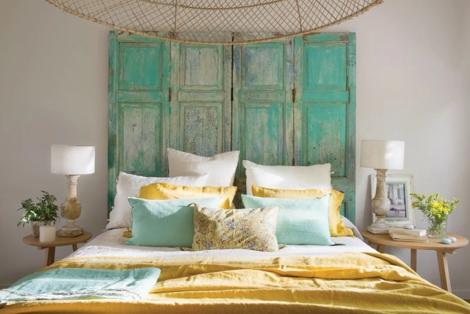 W sypialni głównej crème de la crème całej koncepcji to zagłówek znaleziony w jakimś zakurzonym sklepie z antykami. Tak naprawdę były to stare, niemożebnie zużyte skrzydła drzwi. Asun rzuciła tylko: Bierzemy je! Pomalujemy na turkusowo i gotowe! I choć były stare i bardzo odrapane, kolor na zawsze zmienił im metrykę. Trzeba było malować je z wyczuciem, pokrywać turkusową farbą tylko niektóre fragmenty. Powstał z nich oryginalny zagłówek do łóżka w stylu shabby chic. Drzwi nie można wprawdzie otwierać, ale w głowie Sandry przed snem otwierają się na marzenia.