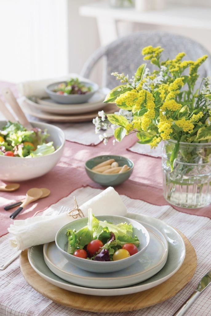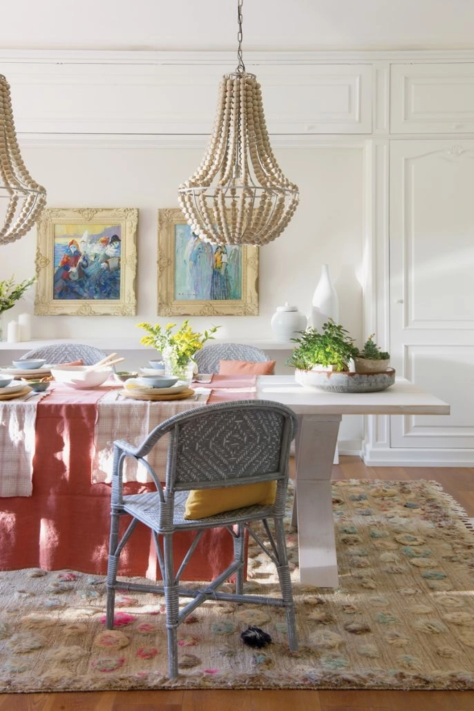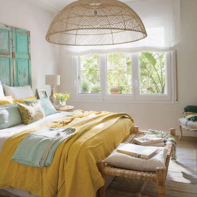 Kolorowe dodatki, naturalne tkaniny i malowane meble