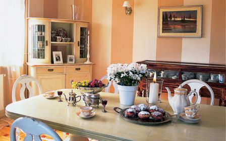 Rumieńców nabrały stuletnia szafa i stół po prababci znalezione na strychu. Stół ozdobiony kwiatowym motywem trafił do kuchni. To ważne miejsce dla pani domu; tutaj „szaleje” z trzema córkami. Jak u prawdziwej gospodyni – wszystko nie tylko wygląda ładnie, ale musi być funkcjonalne. Nawet jubilerska gablota z egzotycznego drewna nie służy tylko do ozdoby. – Chowam tam serwety, sztućce i zastawę. Stoi obok stołu, więc gdy przychodzą goście, wszystko mam pod ręką – opowiada Bożena.