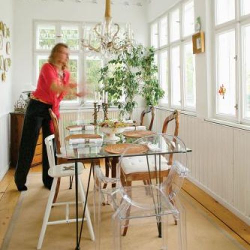 Od czasu do czasu Gabi zachwyca się designerskimi nowościami. Tak było z kompletem krzeseł-duchów. – Musiałam przeprowadzić sprytną akcję strategiczną – opowiada z błyskiem w oku. – Richardowi takie meble się nie podobają, więc nie mogłam ich kupić tak po prostu, dla domu. Znalazłam jednak sposób: dostał je w prezencie na urodziny i wkrótce jakoś się do nich przekonał – dodaje gospodyni.