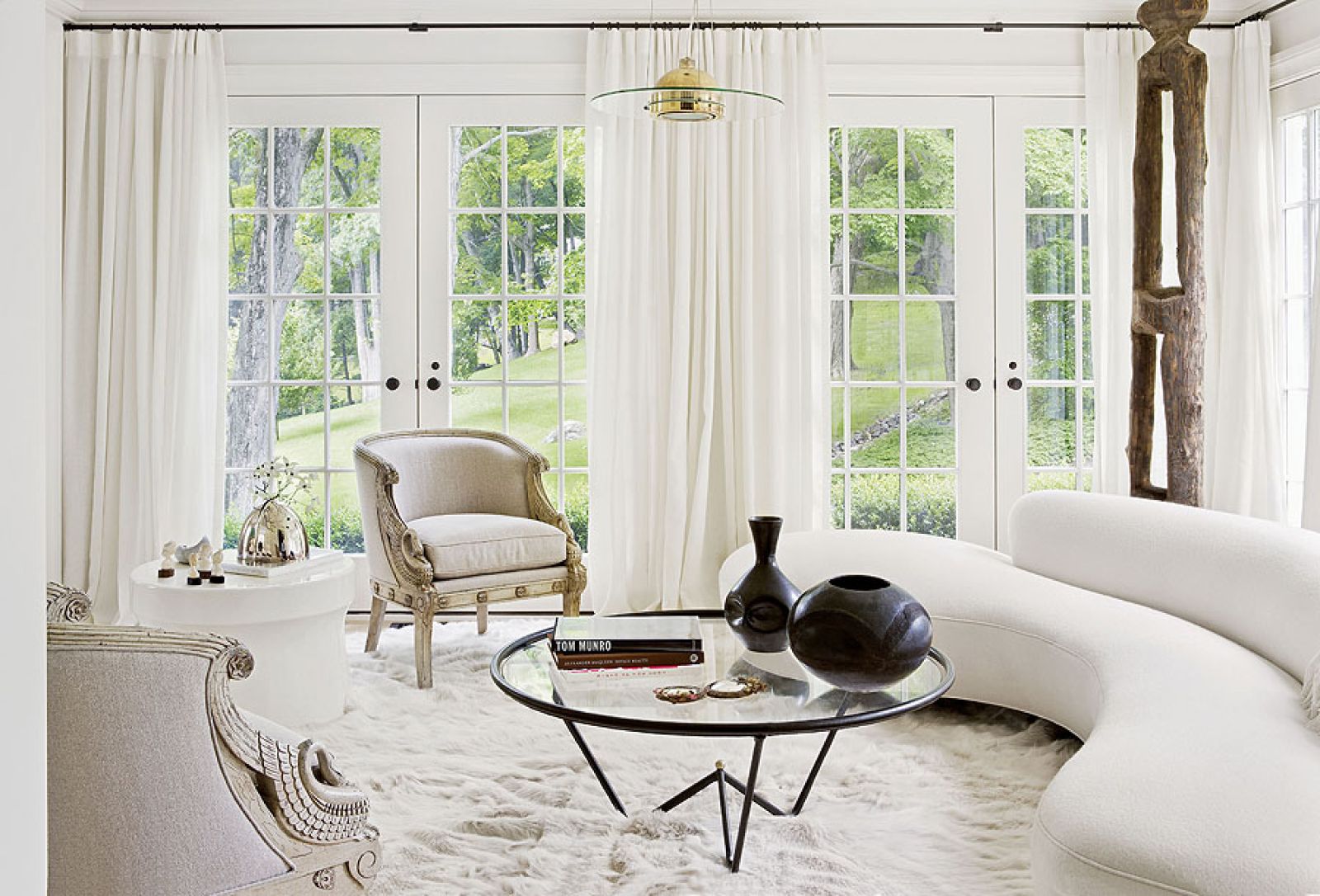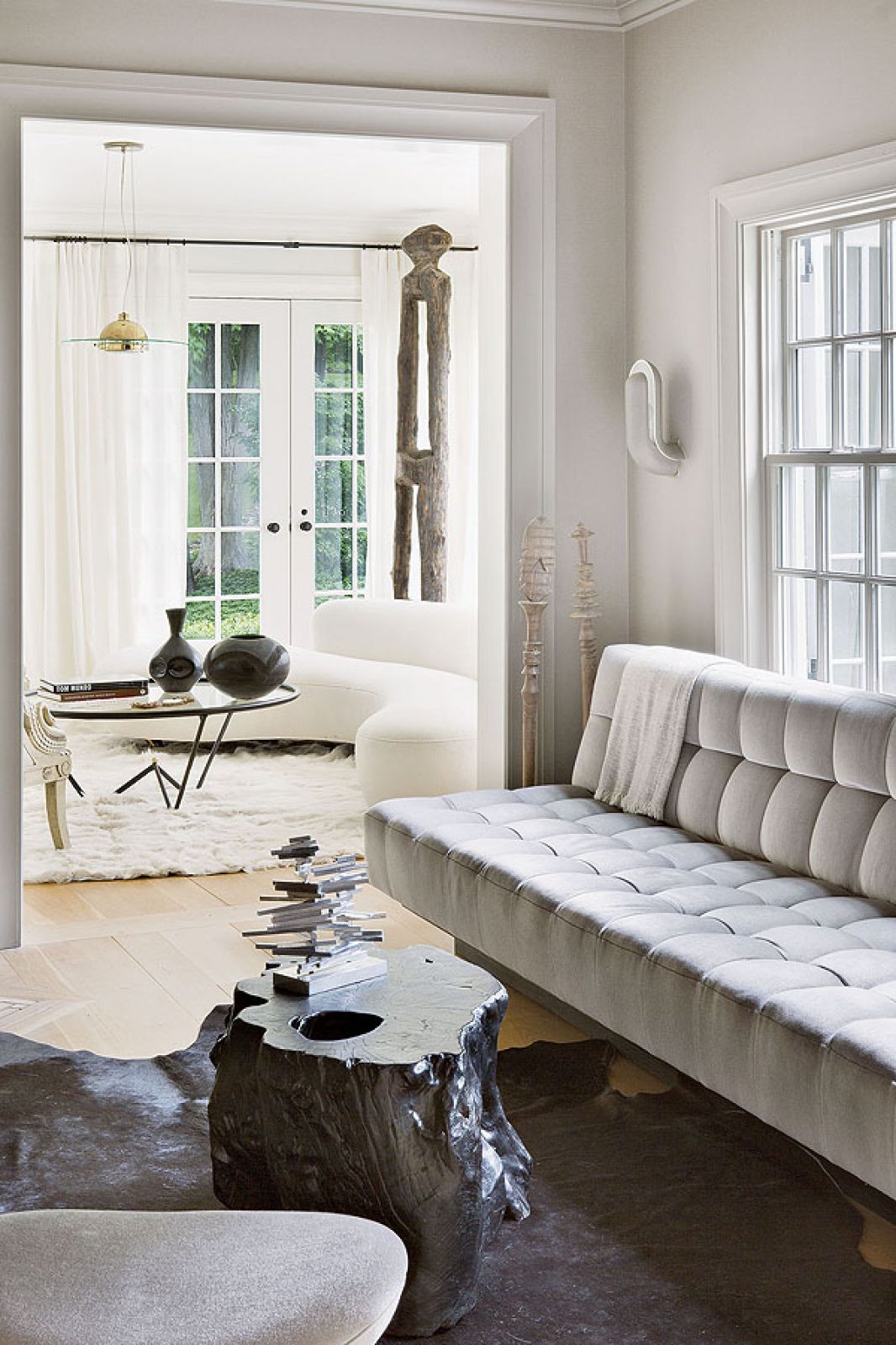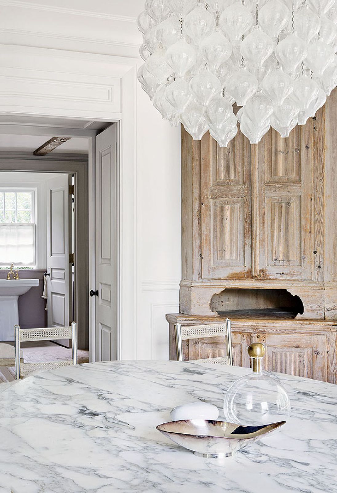 Julie zdobyła kilka mebli w stylu gustawiańskim (np. krzesła w jadalni, tej osobnej, z marmurowym stołem), ale bardziej chodziło jej o gustawiańskiego ducha - subtelność dawkowania rzeczy stylowych i dekoracyjnych, północną kolorystykę i białe tła. Świetnie udało jej się włączyć w to dizajn i sztukę współczesną, co niemal modelowo pokazuje w salonie. Na dywanie z koziej skóry znalazły się zarówno stare szwedzkie fotele, jak i organiczna półokrągła sofa Vladimira Kagana, przyświeca temu włoska lampa, a z rogu „patrzy” na to wszystko olbrzymia prymitywna rzeźba.