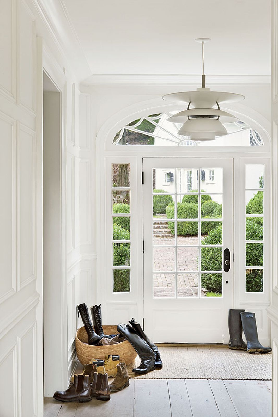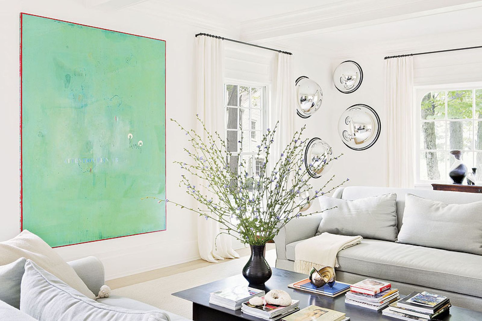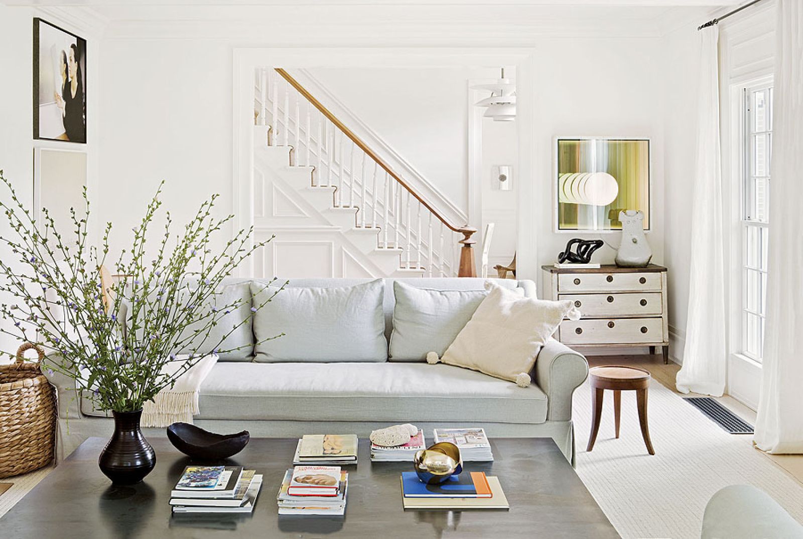 Julie zdobyła kilka mebli w stylu gustawiańskim (np. krzesła w jadalni, tej osobnej, z marmurowym stołem), ale bardziej chodziło jej o gustawiańskiego ducha - subtelność dawkowania rzeczy stylowych i dekoracyjnych, północną kolorystykę i białe tła. Świetnie udało jej się włączyć w to dizajn i sztukę współczesną, co niemal modelowo pokazuje w salonie. Na dywanie z koziej skóry znalazły się zarówno stare szwedzkie fotele, jak i organiczna półokrągła sofa Vladimira Kagana, przyświeca temu włoska lampa, a z rogu „patrzy” na to wszystko olbrzymia prymitywna rzeźba.