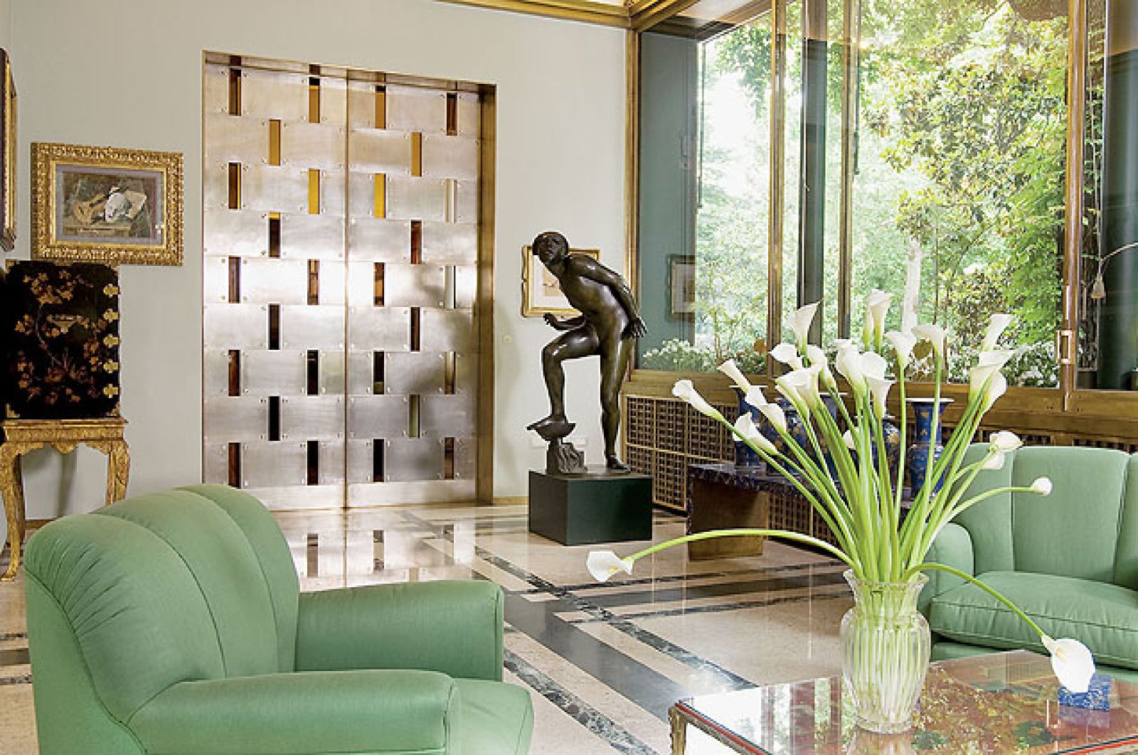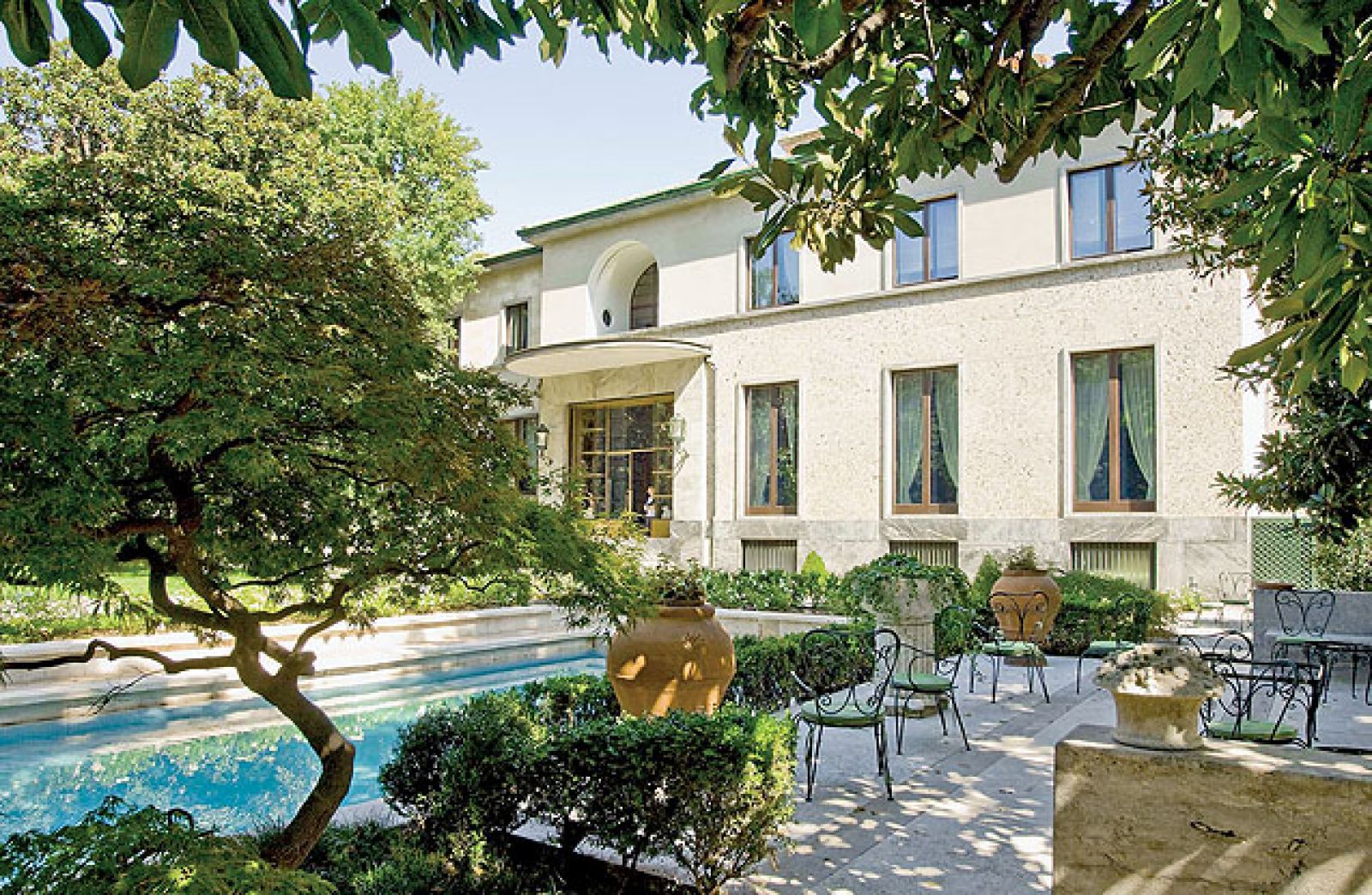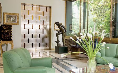 Całe miasto plotkowało więc o ukrytych za szpalerem bujnych drzew cudach – szafie-galerii przypominającej raczej nawę w kościele, a nie garderobę, podgrzewanym basenie, korcie tenisowym, rozsuwanych metalowych drzwiach do oranżerii, ozdobionych geometrycznymi wzorami, szklanych ścianach, przez które ogród dosłownie wdziera się do środka, i o wrotach wejściowych wysokich na pięć metrów, z przejrzystych tafli oprawionych w mosiądz. Tylko przyjaciele rodziny, między innymi scenograf z La Scali (miał nawet swój pokój gościnny), zapraszani tu na imprezy, mieli okazję przekonać się, że krążące o cudownym domu plotki są prawdziwe.