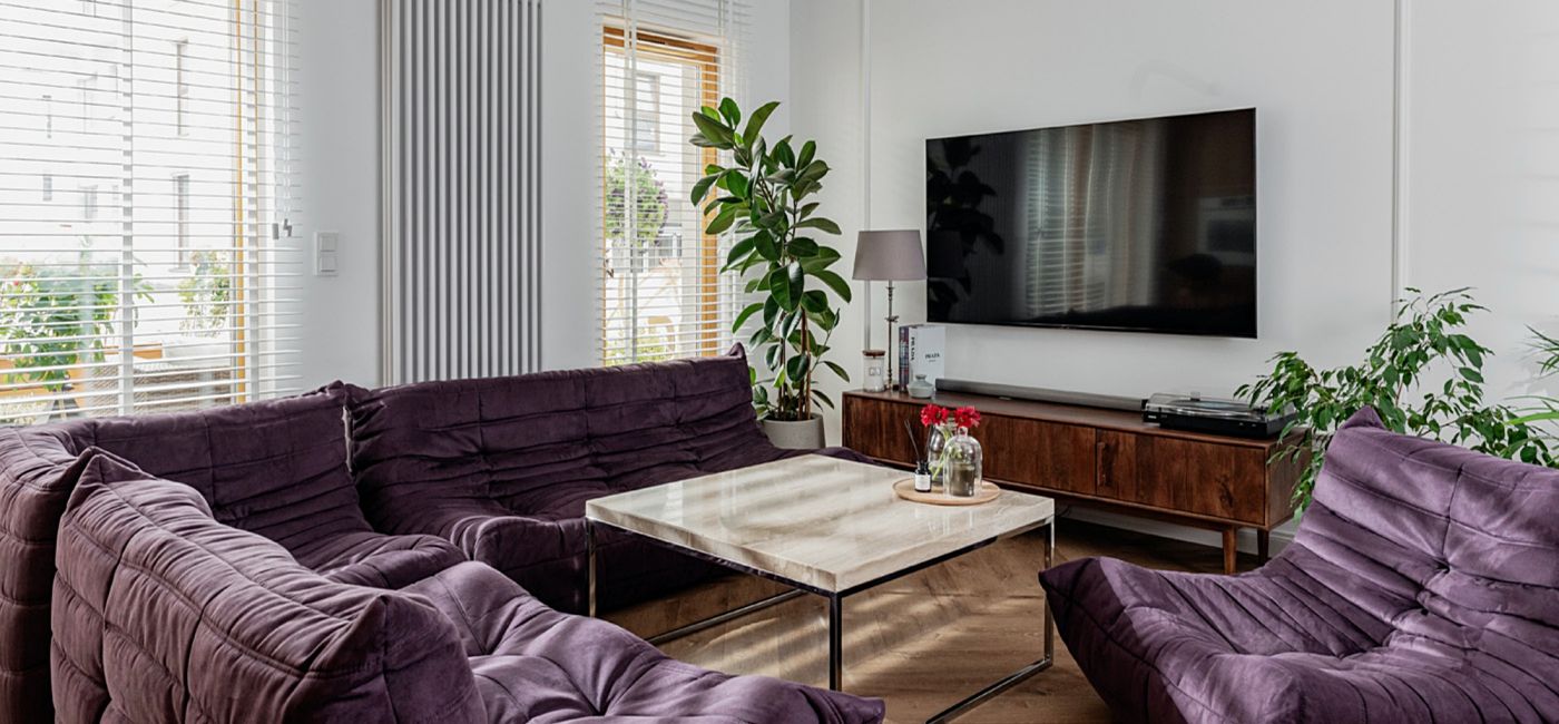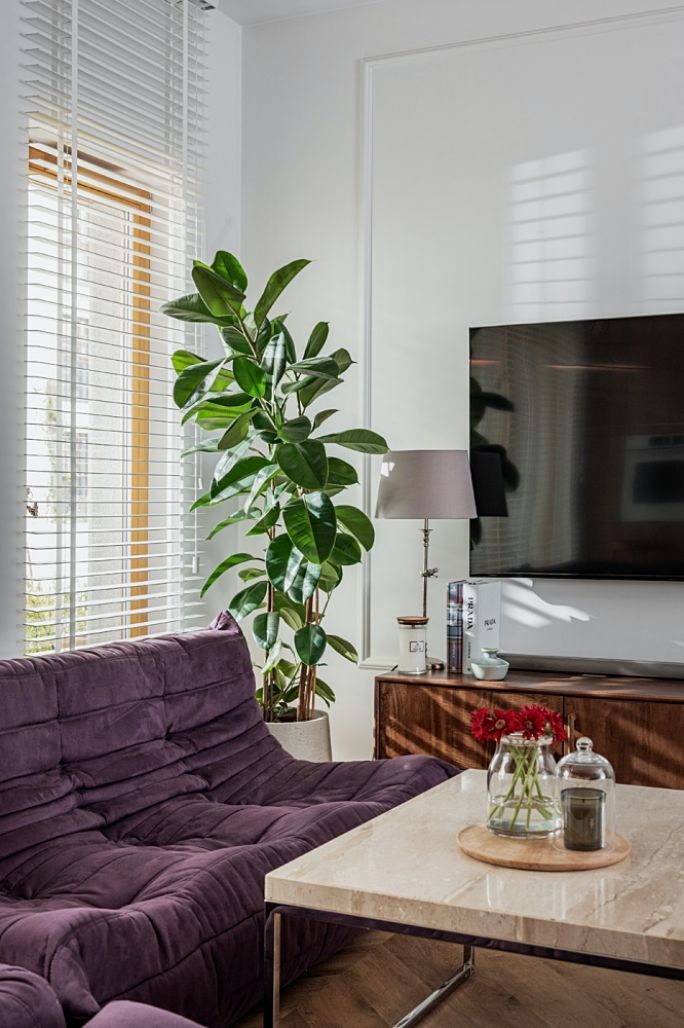 W głębi, za jadalnią, urządzono część wypoczynkową. Kultowy komplet sof i foteli z lat 70. projektu Michela Ducaroya, który stanął w tej przestrzeni jest największą dumą właścicielki. Marszczone, niskopodłogowe siedziska z poliuretanowej pianki, mimo, że mają już 50 lat wciąż wyglądają bardzo nowocześnie. Najczęściej można zobaczyć je w skórze, natomiast właścicielce udało się upolować set w nietypowej bakłażanowej tapicerce, który robi ogromne wrażenie na gościach. Stanął przy nim stolik kawowy z marmurowym blatem, a pod telewizorem duński sideboard z drewna palisandrowego.