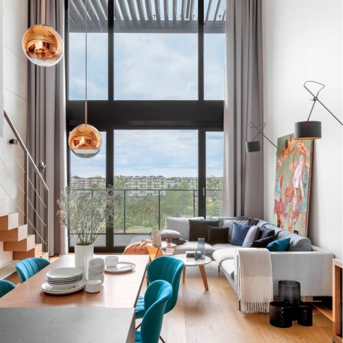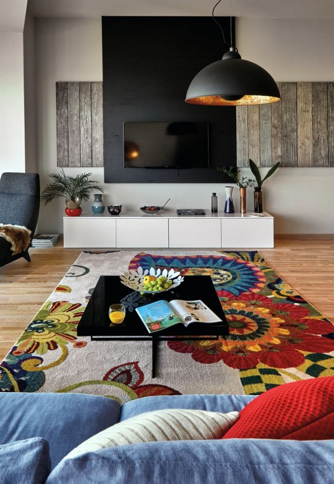 Surowe wnętrze można również ocieplić kolorowym dywanem albo miękkimi poduszkami. W wyborze dodatków wskazany jest jednak umiar. Warto postawić raczej na jeden designerski fotel, stolik albo wazon niż na całą gamę dekoracji, które mogą przytłoczyć wnętrze. Wystarczy jeden designerski akcent, aby salon nabrał charakteru.