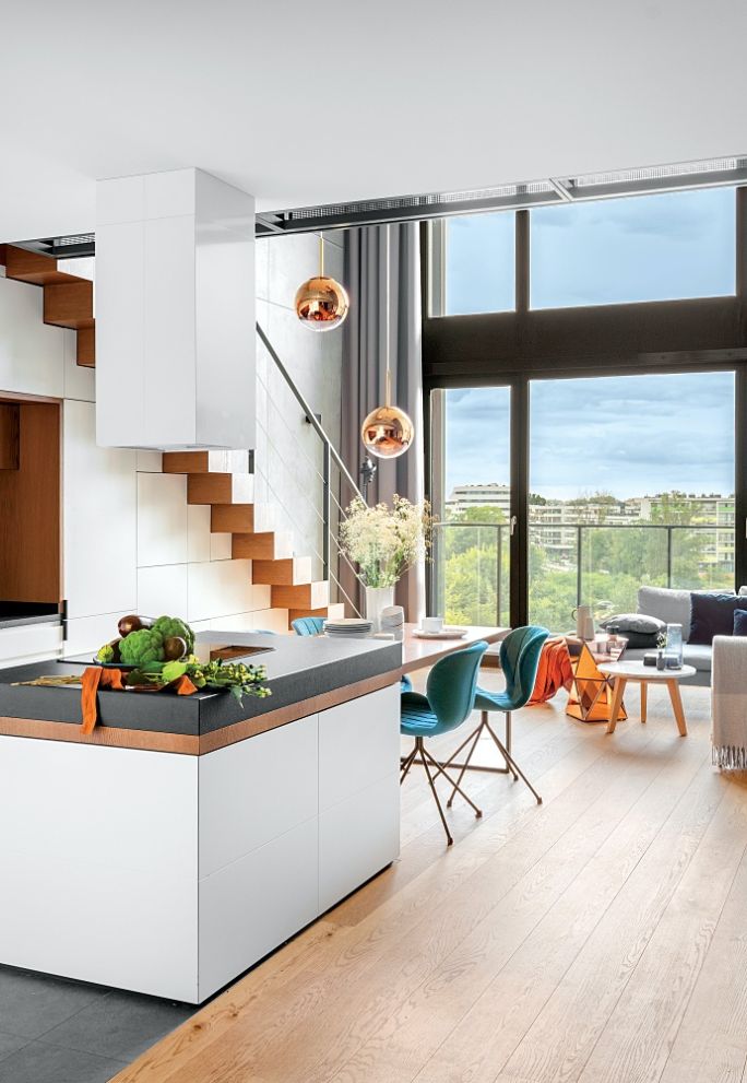Aranżacja nowoczesnego wnętrza idealnie sprawdzi się w przypadku, kiedy mamy mieszkanie lub dom, w którym jest salon połączony z kuchnią lub aneksem kuchennym. W ten sposób można zyskać dodatkowe metry - dosłownie i wizualnie, bo takie wnętrze wyda się znacznie większe. Najbardziej popularnym rozwiązaniem, szczególnie w małych przestrzeniach, jest salon z aneksem kuchennym, gdzie kuchnia zajmuje wyłącznie jedną ścianę. Częstym rozwiązaniem jest też funkcjonalna kuchnia z wyspą, gdzie wyspa oddziela od siebie strefę odpoczynku od strefy gotowania - sprawdzi się jako dodatkowe miejsce do przygotowywania posiłków, a potem może też pełnić funkcję stołu.
