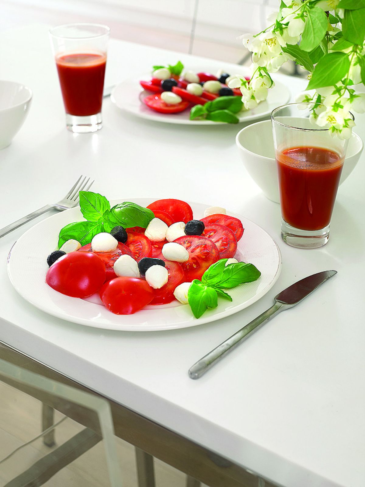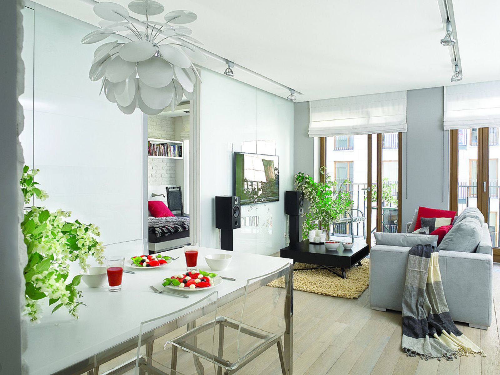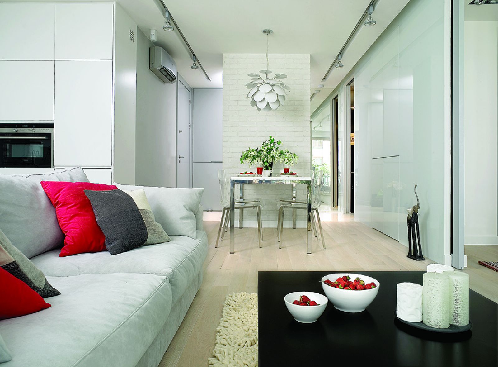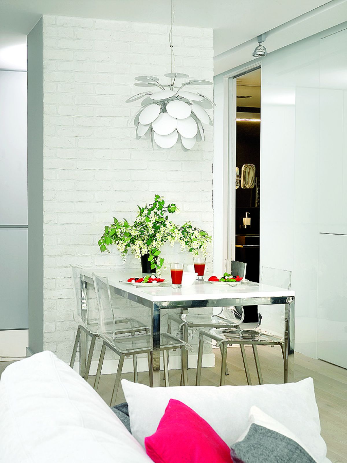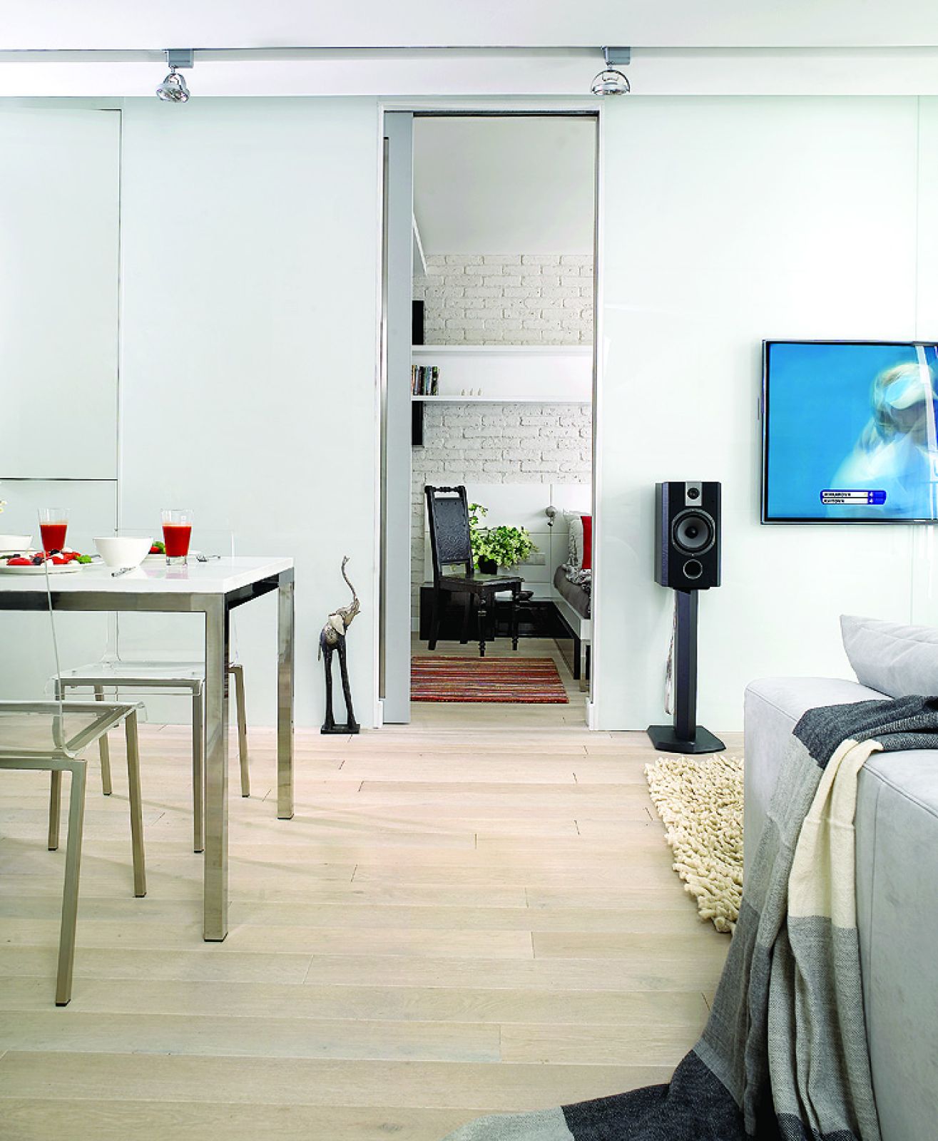 Prosta aranżacja wnętrza: biel, wysoki połysk, przesuwane drzwi