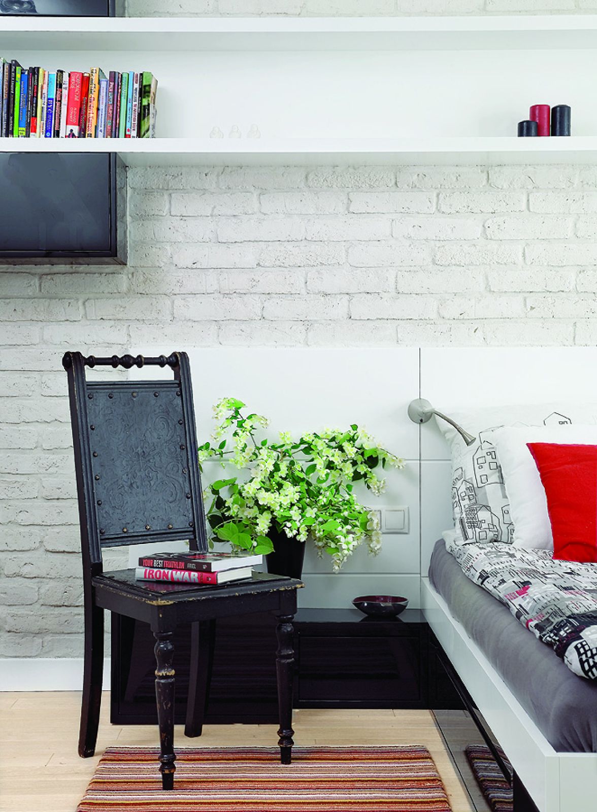 Wystrój? Prosty, niewymuszony. – Poprzednie mieszkanie było dla mnie zbyt kolorowe, a ja we wnętrzu szukam głównie bieli i spokoju – mówi Rafał. Biała jest więc cegła na jednej ze ścian w sypialni oraz na ściance działowej w salonie, biała jest kuchnia, białe – i na wysoki połysk – przesuwane drzwi, białe lampy i rzymskie rolety w oknach. Ale z tą bielą wcale nie było łatwo. – Adam przyniósł kilka próbek różnych jej odcieni i mieliśmy problem. Dla mnie biel to biel. Jednak architekt i moja żona widzieli różnicę. Dyskusje, które odcienie wybrać i czy będą do siebie pasowały, trwały do późnej nocy – wspomina.
