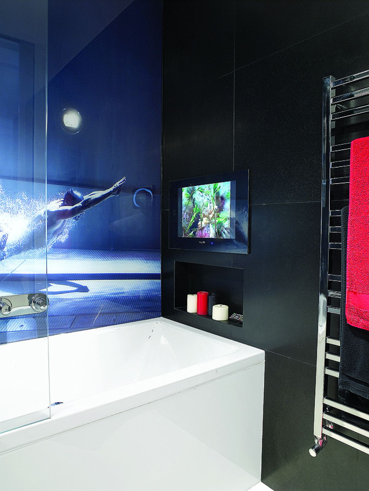 Biała nie jest tylko łazienka – bo z dodatkiem czerni. I ze zdjęciem pływaka zatrzymanego w kadrze w momencie, gdy wskoczył do wody. – Przypomina mi, że zamiast do pobliskiego Wedla powinienem pójść na trening – śmieje się Rafał.