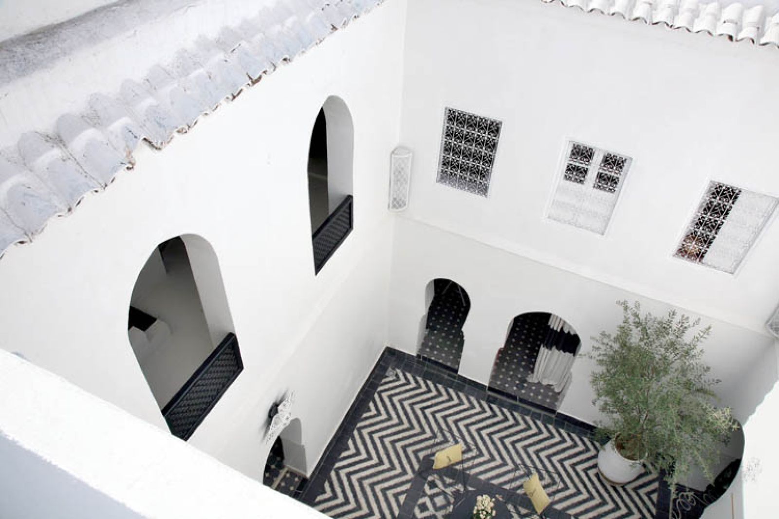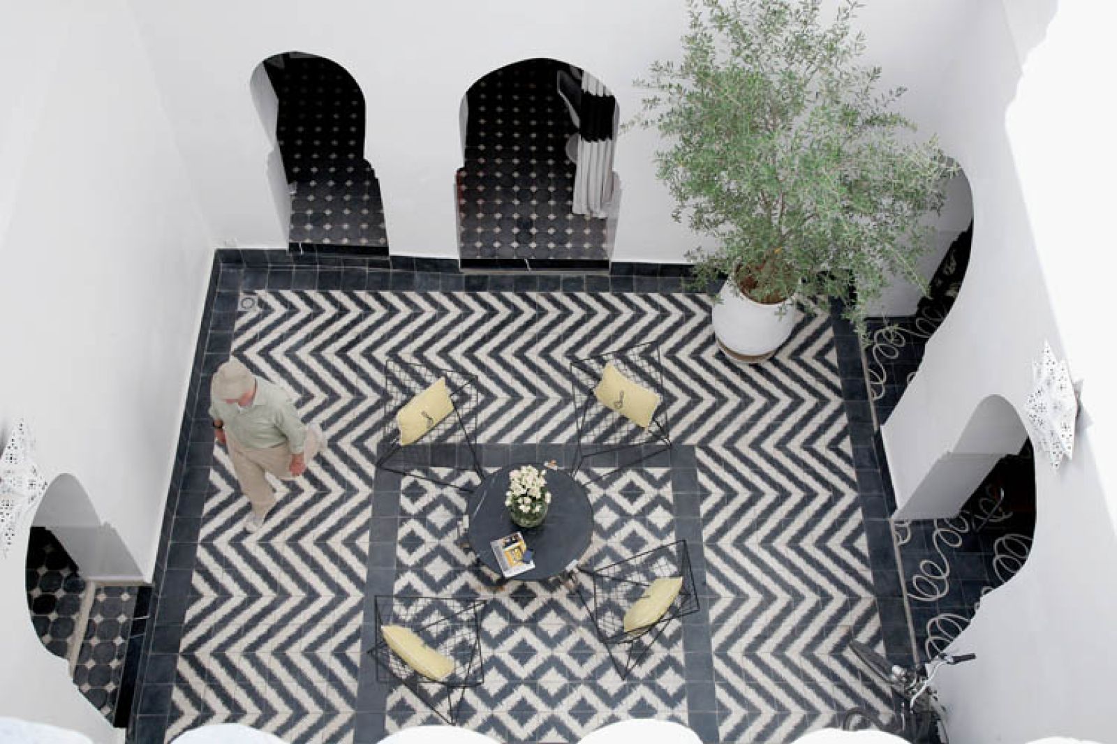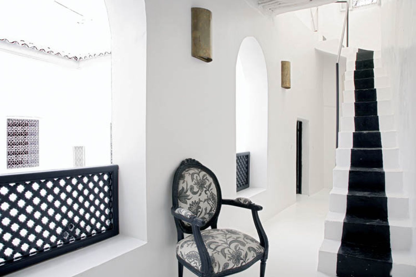 Płytki na dziedzińcu są czarno-białe, wokoło ciągnie się pas geometrycznego wzoru. Zachwyca ich prosta architektura i symetria budynku – stajesz w dowolnym miejscu, patrzysz i masz gotowy obraz, z powtarzającymi się łukami, oknami albo rysunkiem schodów. To typowy otwarty dom. Wokół patio jest krużganek. Na parterze kuchnia, salon, łazienka, pomieszczenia gospodarcze. Na piętrze trzy sypialnie i schody na dach. Wszystkie wąskie i bardzo wysokie.