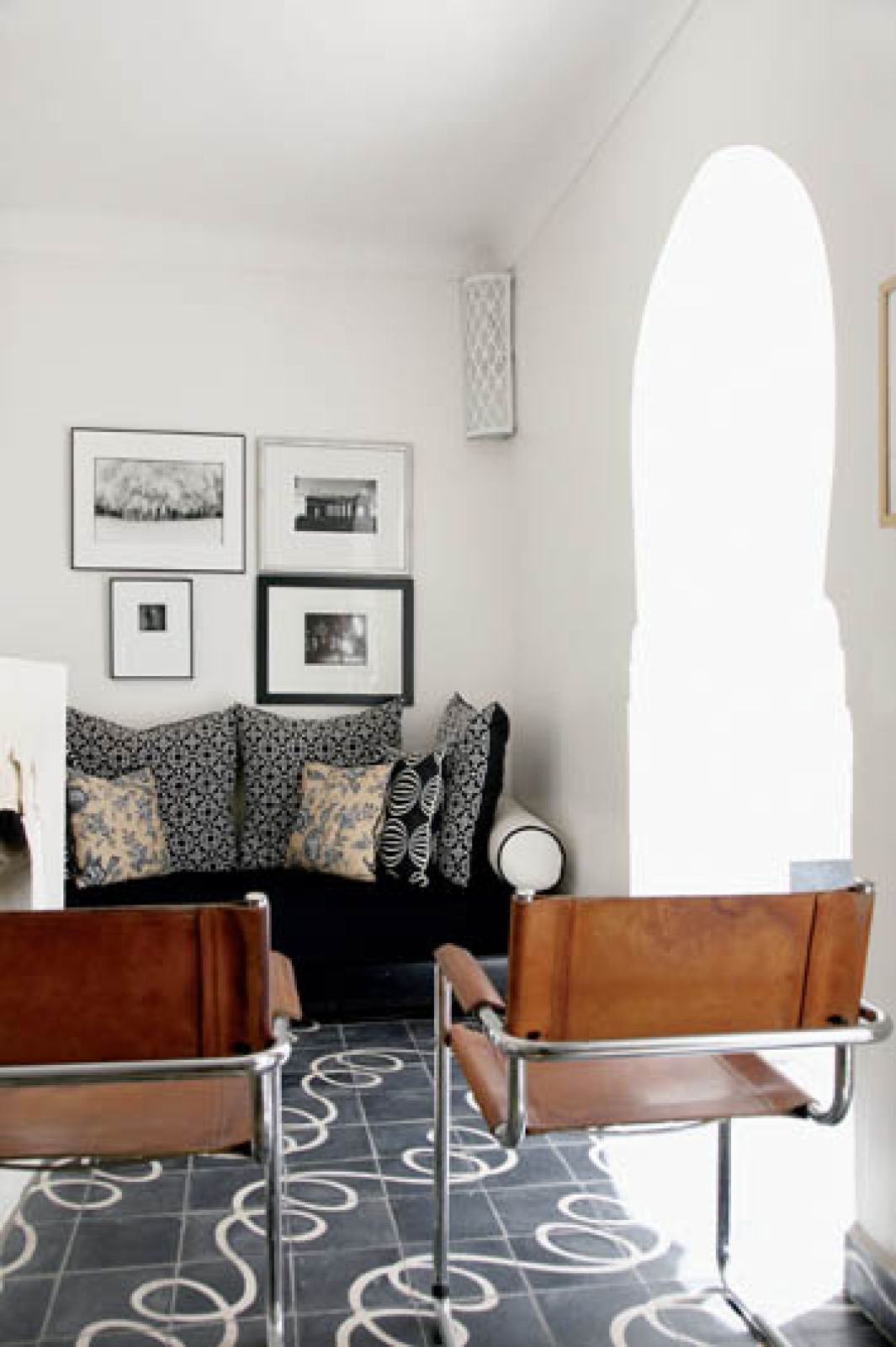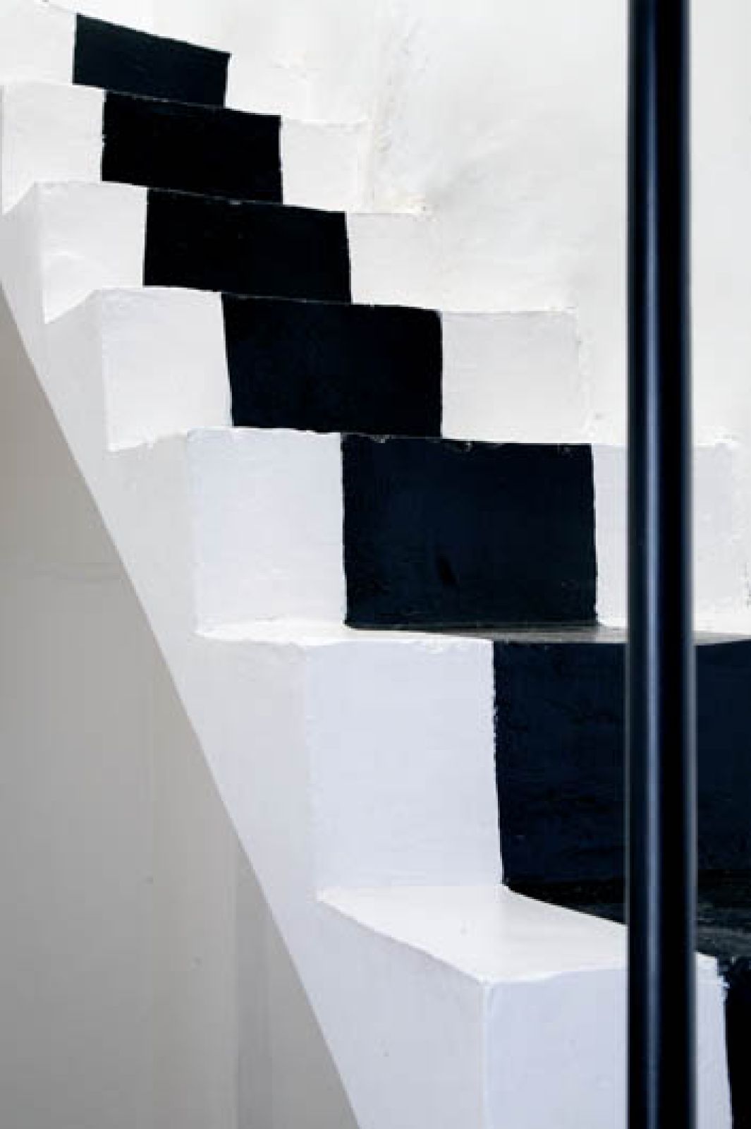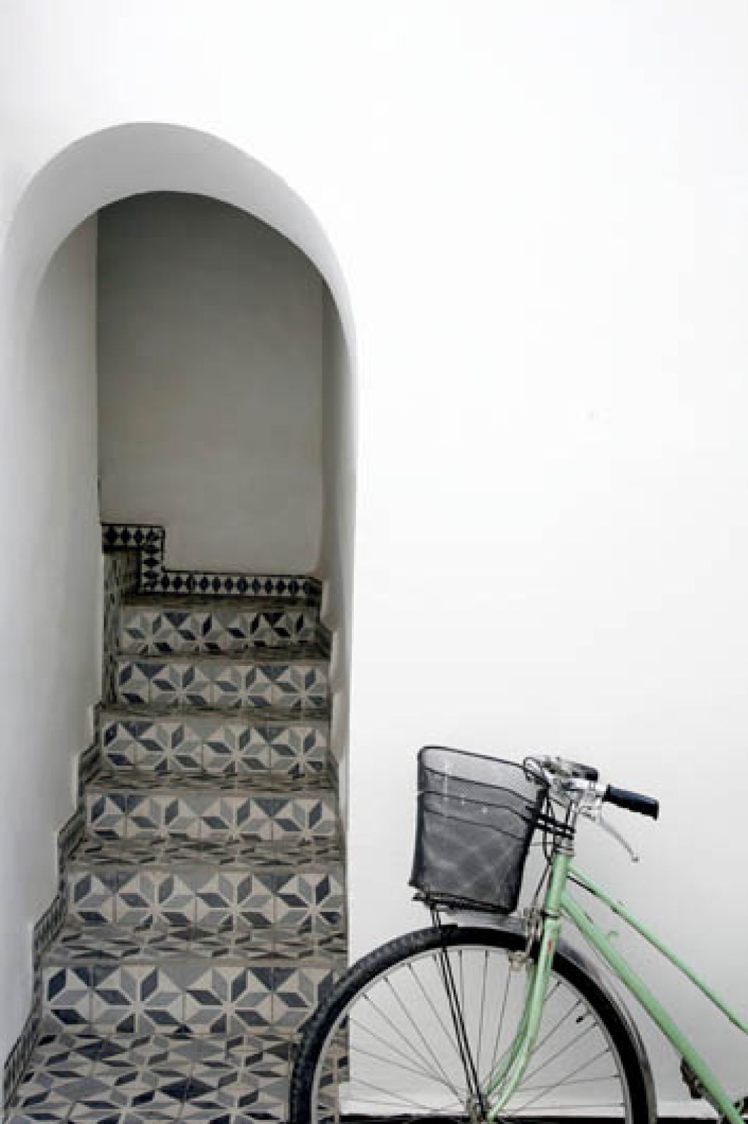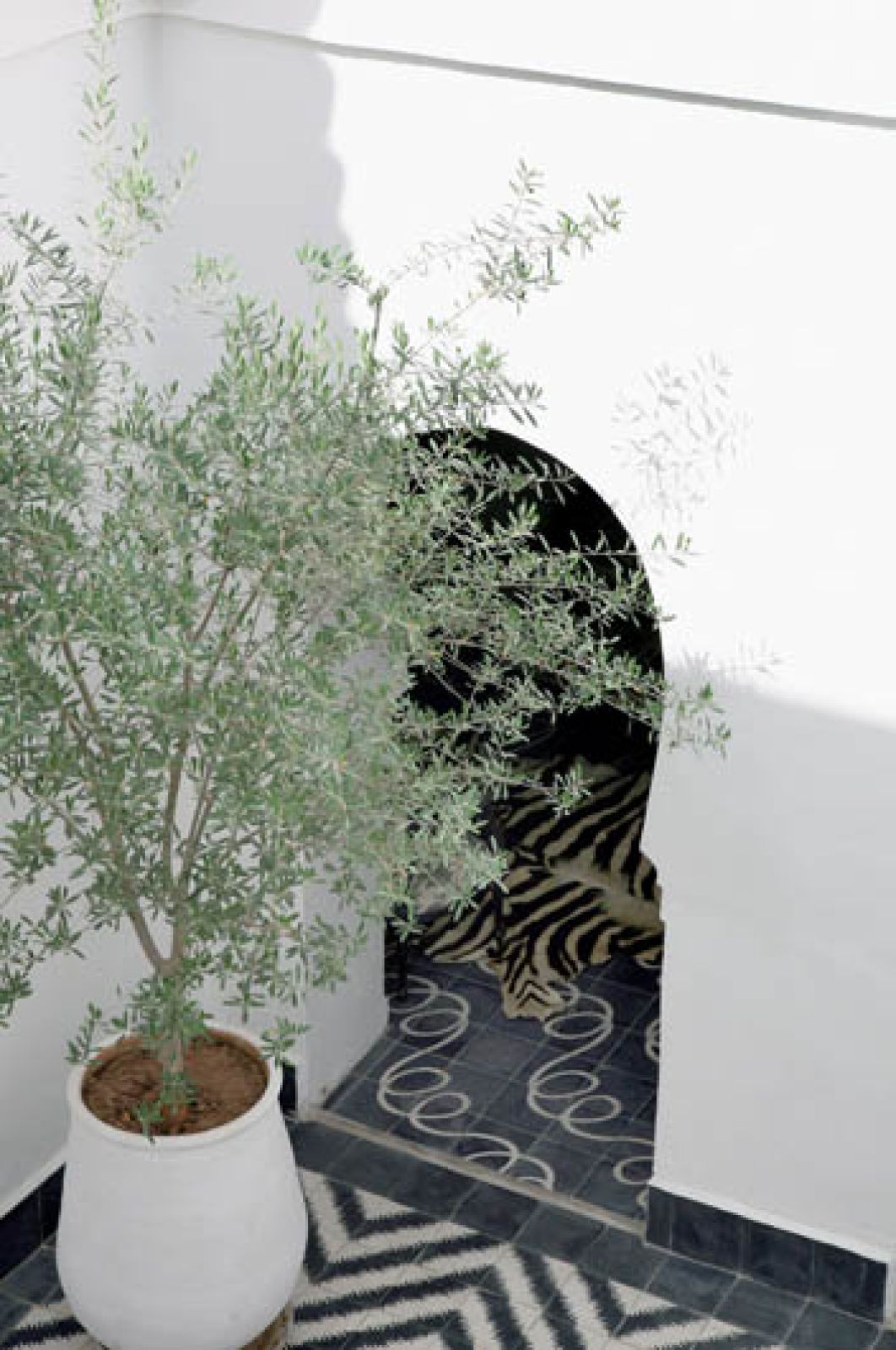 Płytki na dziedzińcu są czarno-białe, wokoło ciągnie się pas geometrycznego wzoru. Zachwyca ich prosta architektura i symetria budynku – stajesz w dowolnym miejscu, patrzysz i masz gotowy obraz, z powtarzającymi się łukami, oknami albo rysunkiem schodów. To typowy otwarty dom. Wokół patio jest krużganek. Na parterze kuchnia, salon, łazienka, pomieszczenia gospodarcze. Na piętrze trzy sypialnie i schody na dach. Wszystkie wąskie i bardzo wysokie.