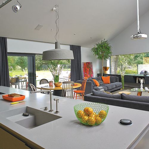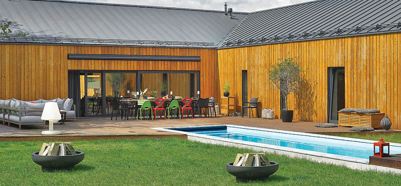 Zaczęli obdzwaniać architektów, ale wszyscy odsyłali ich z kwitkiem. Wtedy Kasia przypomniała sobie o koledze z liceum. Odszukała go – Łukasz Przybyłowicz nie odmówił. Przeglądając kiedyś album o ikonach współczesnej architektury, zachwyciła się modernistyczną kaplicą w Valleaceron w Hiszpanii; chciała, żeby jej dom ją przypominał. Parterowy budynek, ale wysoki na dwie kondygnacje powstał na planie krzyża. Ruda elewacja z modrzewia syberyjskiego spowodowała, że zlewa się z przyrodą. Przez gigantyczne tafle szkła zieleń przenika do domu.