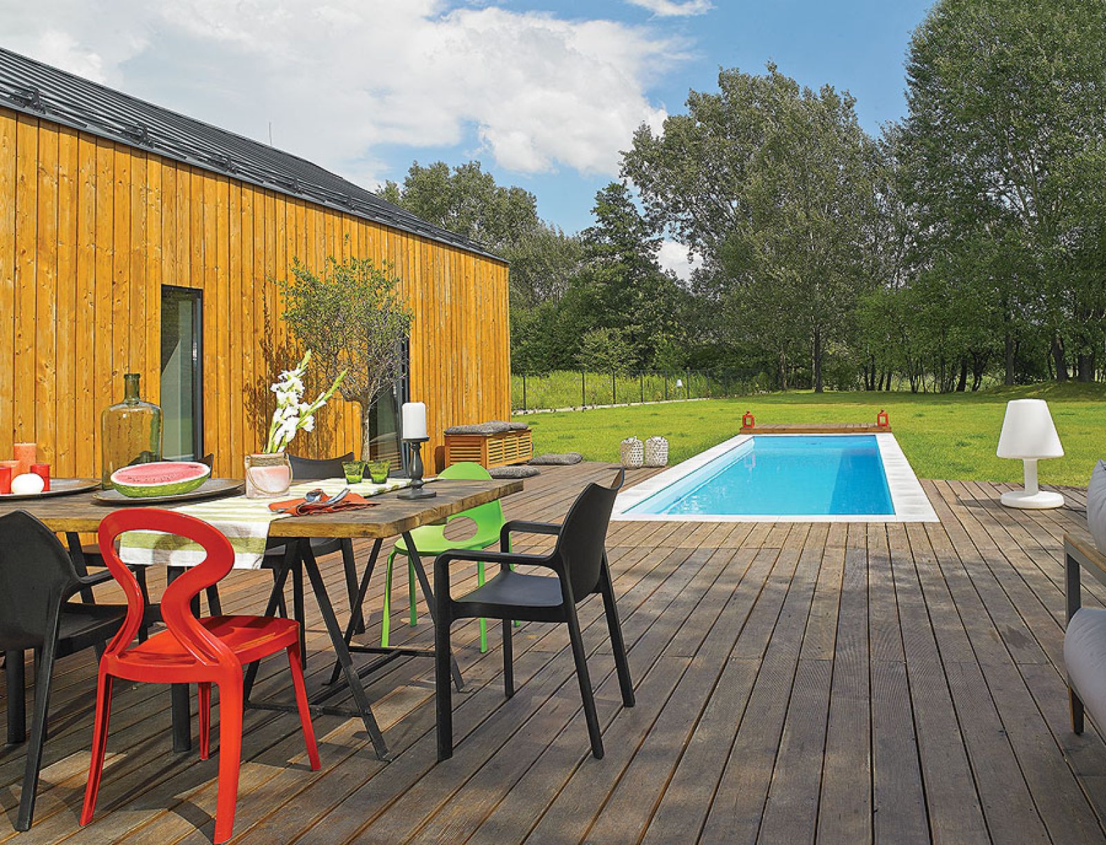 Drzewa: oliwka, cytryna i fikus benjamina, zasadzone w wielkich donicach, rosną wewnątrz domu. Ale tylko jesienią i zimą, bo latem, podobnie jak inni domownicy, wolą wygrzewać się na tarasie przy basenie.