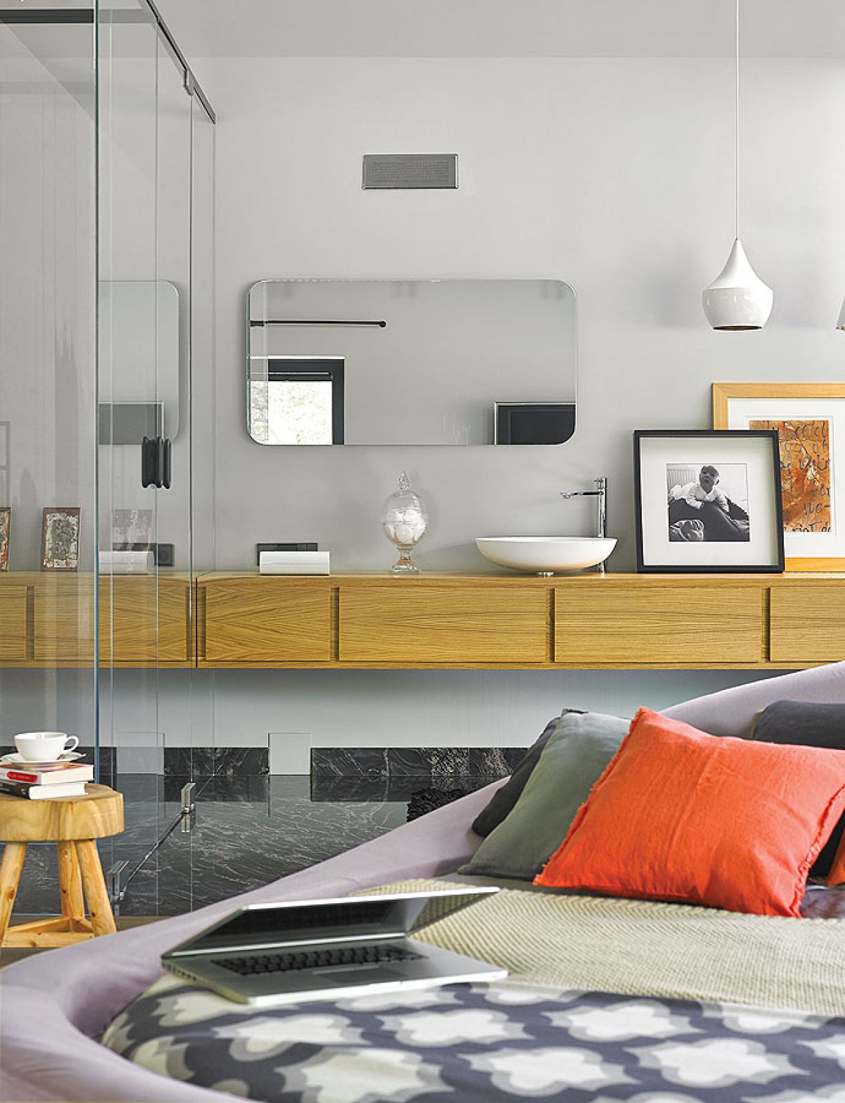 Wreszcie sypialnia i łazienka – te urządziła na jasno. Łóżko w nieregularnym kształcie nieźle tu zamieszało. Kasia wymarzyła sobie, żeby przy sypialni mieć ogromną garderobę, ale kiedy zobaczyła łoże przypominające polny kamień, wiedziała, że musi być jej. Okazało się za wielkie do sypialni; dla niego zrezygnowała z przestronnej garderoby (skurczyła się do rozmiarów sporej szafy).