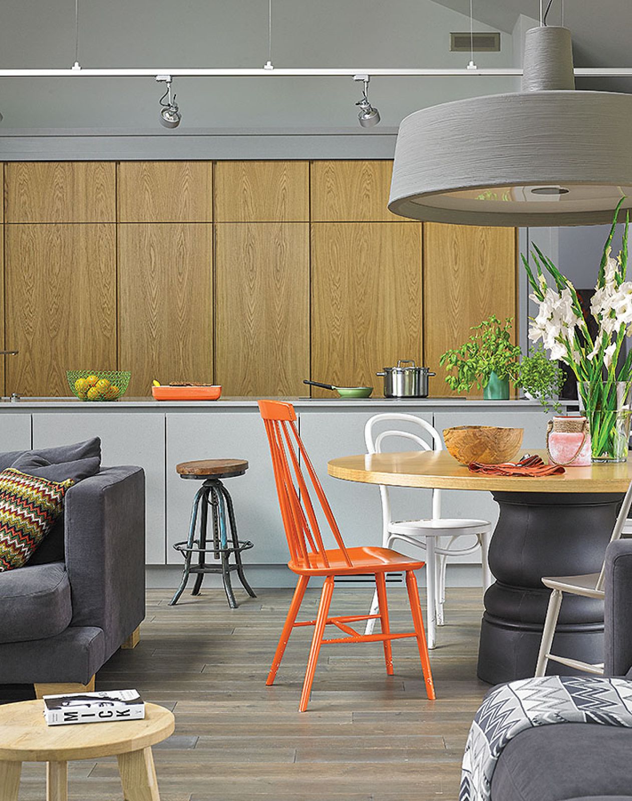 > Ciepłe drewno i chłodne szarości: aranżacja mieszkania