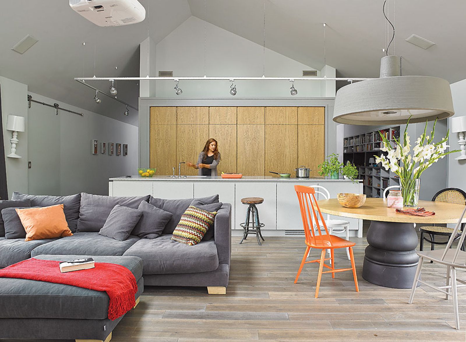 Kasia jest szczególnie dumna z dębowej kuchni, którą sama zaprojektowała. Ogromna wyspa z wygodnym corianowym blatem to najważniejsze miejsce w domu. Kryje mnóstwo szafek, kuchenkę i dwie zmywarki. A za nią kolejne niespodzianki – za przesuwanymi drzwiami sprytnie ukryto kącik kawowy i spiżarnię.