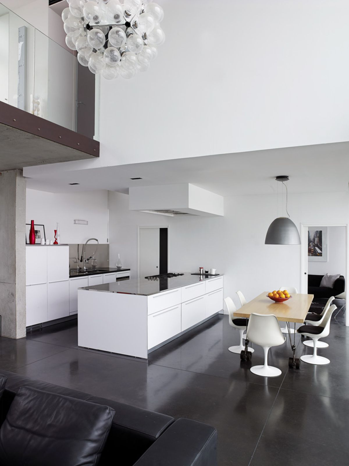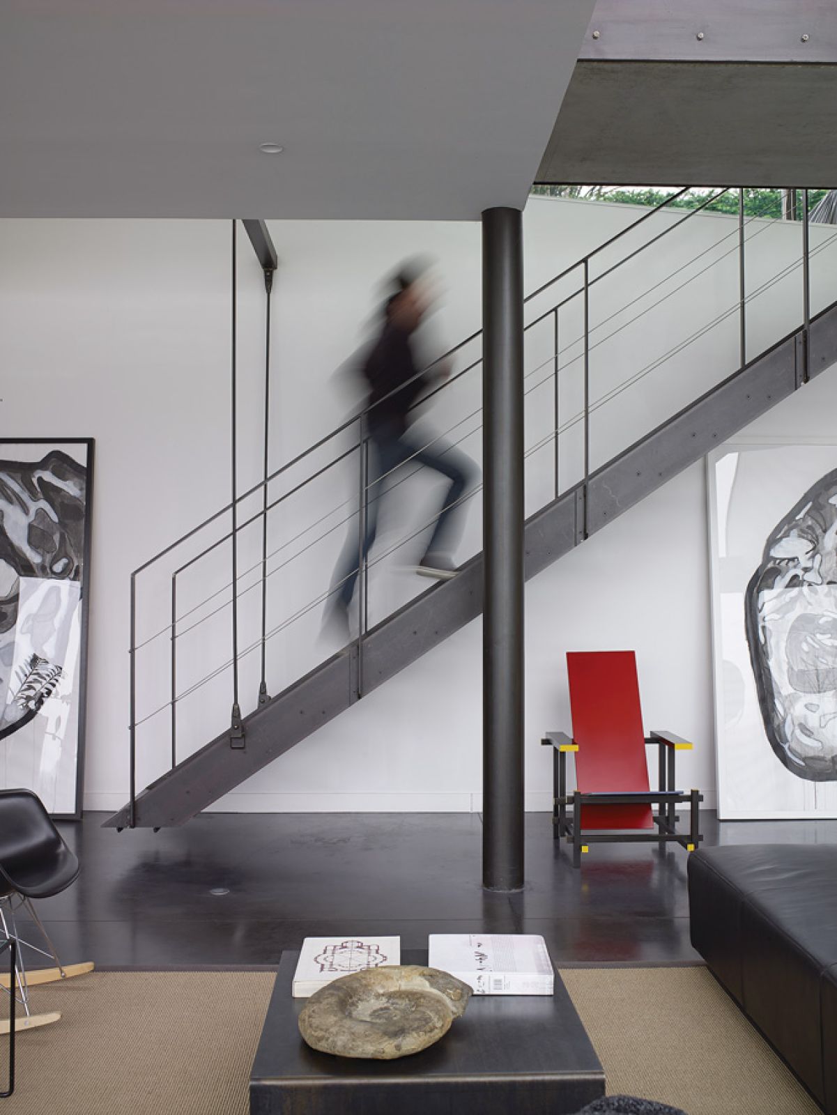 Dom ma aż 260 metrów kwadratowych, ale wygląda na jeszcze większy. Pierre lubi dalekie perspektywy (takie ma za oknami) i dlatego nie wydzielił pomieszczeń ścianami, tylko umownie je zaznaczył: bibliotekę od salonu oddzielił kominkiem, a kuchnię urządził w narożnej wnęce. Biszkoptowy Dom wydaje się też niezwykle wysoki, bo zamiast osobnego piętra ma lekką antresolę. A to, co zwykle ciężkie – schody i kominek – jest podwieszone. Wreszcie surowe materiały (beton, metal i szkło), proste, choć dizajnerskie meble i oszczędne dekoracje nie zabierają miejsca i pozwalają podziwiać to, co tutaj najważniejsze, czyli krajobrazy za oknem.