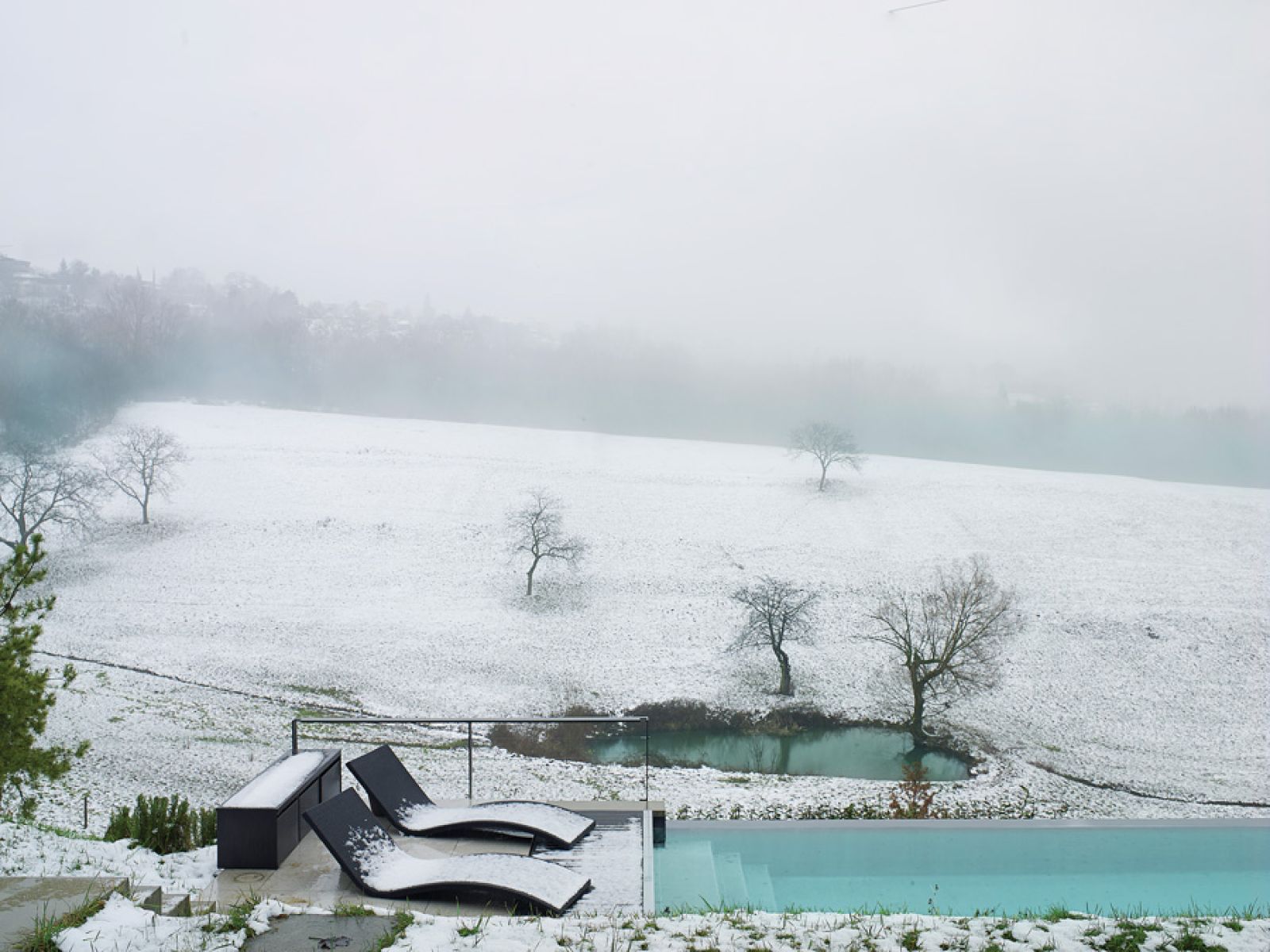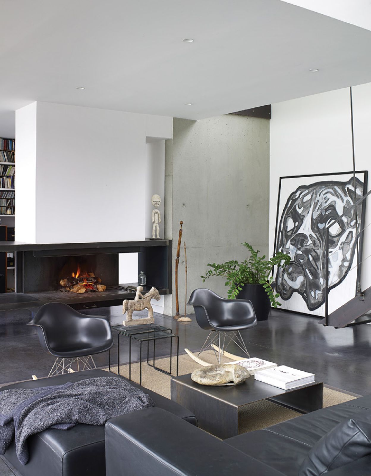To on był najważniejszy przy budowie tego domu. Właściwie nie powinien stanąć tu żaden budynek, bo działka graniczy z rezerwatem przyrody. Ale nazwisko francuskiego architekta, Pierre’a Minassiana, który idealnie dopasowuje swoje projekty do otoczenia, było gwarancją, że to, co powstanie, nie zepsuje widoku. I faktycznie: prosty kubik nie jest konkurencją dla przyrody, lecz idealnie się w nią wtapia. Ze szkła i betonu, jest surowy jak zbocze, do którego się przytulił. Ma zewnętrzne, drewniane żaluzje, a dzięki przesuwanym oknom (8 na 3 metry) przyroda wchodzi do środka. Tam z niczym nie konkuruje, bo we wnętrzach panuje kolorystyczna dyscyplina, tylko naturalne szarości, czernie, biel i beż.