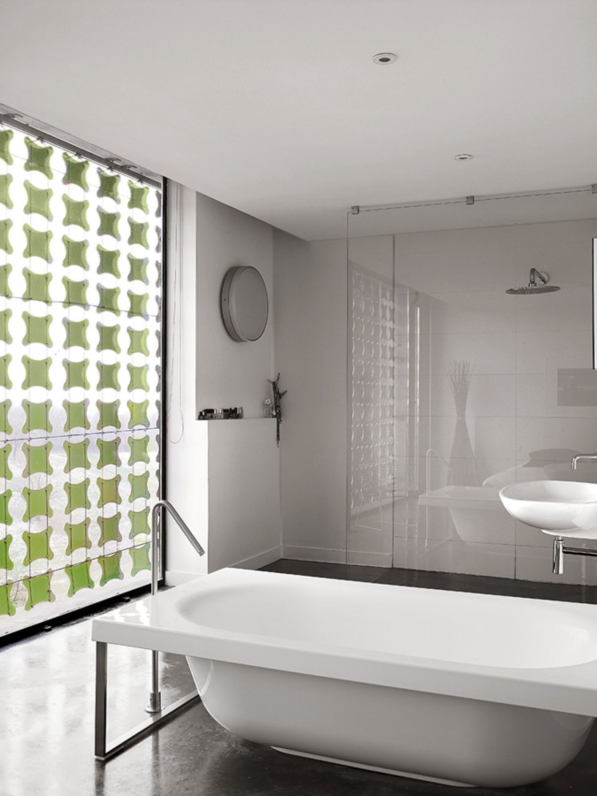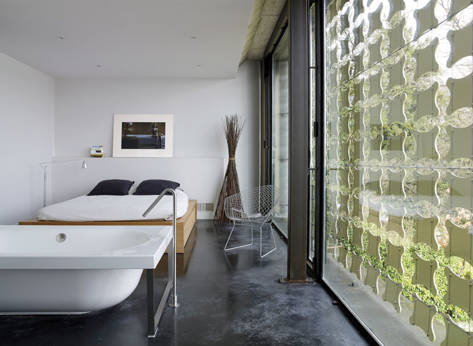 Za przytulny nastrój w sypialni odpowiadają ażurowe zewnętrzne żaluzje. Po pierwsze, pięknie wpuszczają światło, bo gdy dzień jest pogodny, w pomieszczeniu pojawiają się cienie jakby orientalnej mozaiki. Po drugie, skutecznie osłaniają przed słońcem pokój, który położony jest od wschodu i ma ogromne szklane ściany. Żaluzjom dom zawdzięcza także swoją nazwę – Biscuit House. Podobno wymyślił ją pewien francuski dziennikarz, któremu drewniane ażury skojarzyły się z biszkoptami. Intymność potęguje wystrój sypialni – Pierre urządził ją trochę w duchu japońskim – wstawił minimum sprzętów, wybrał biel; nawet fotografia w klimacie przypominająca obrazy Edwarda Hoppera każe się wyciszyć i pomedytować.