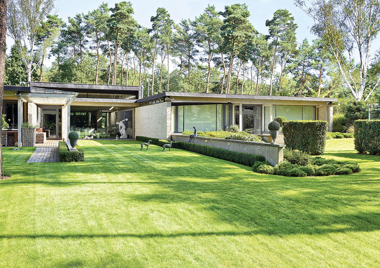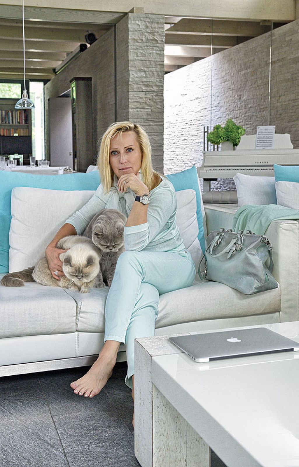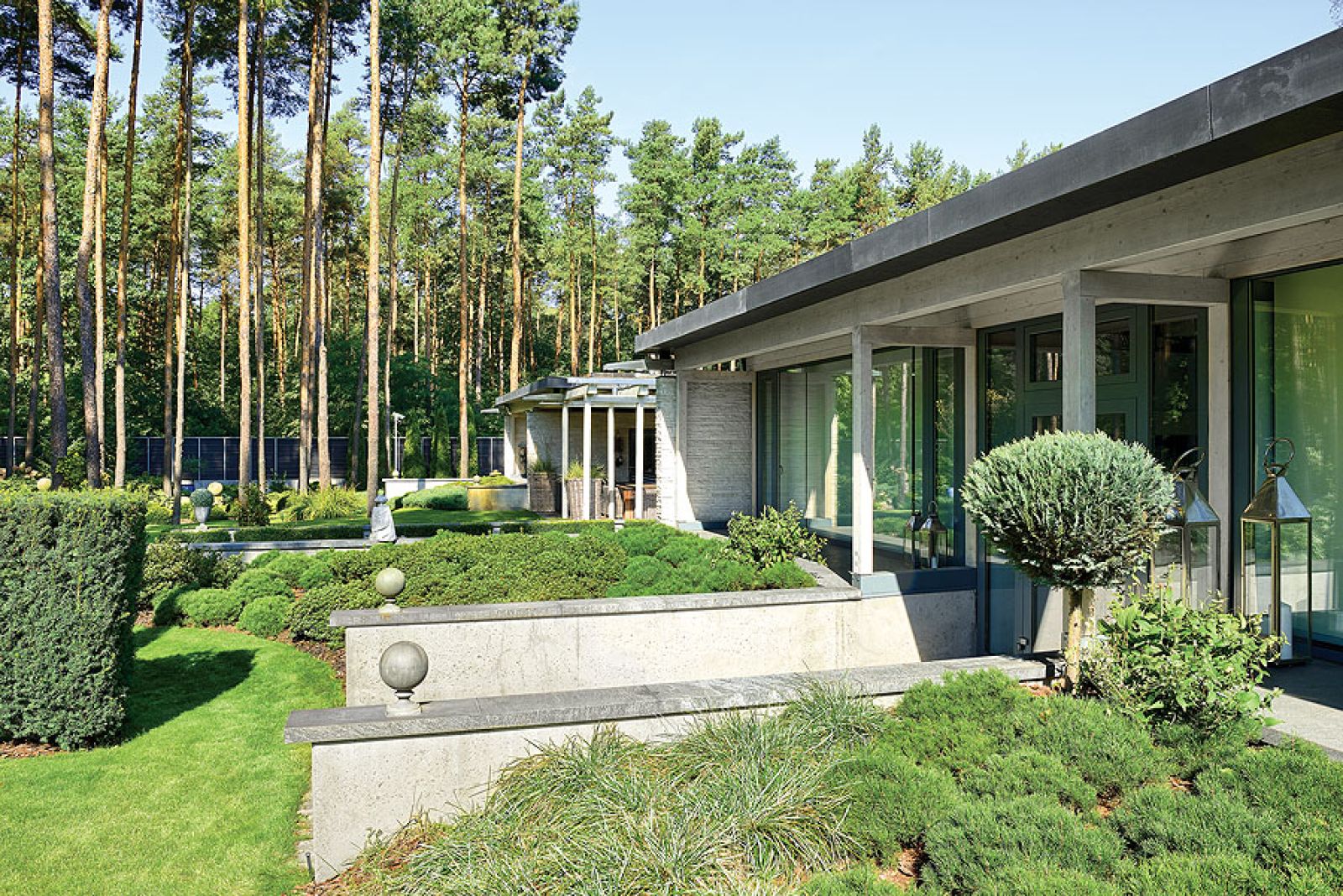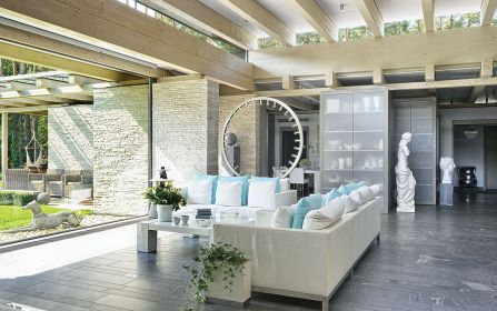 Pierwsza propozycja od razu jej się spodobała. Tylko naturalne materiały: kamień, szkło, drewno. Mnóstwo przeszkleń i aż jedenaścioro drzwi, z każdego pokoju można wyjść do ogrodu. – Uwielbiam światło, słońce – mówi – dach nigdzie nie styka się ze ścianami. Dookoła pod sufitem biegnie długi płaski świetlik. Gdy się stanie na pagórku po jednej stronie ogrodu, drugi koniec widać przez te okna. Dzięki lekkiej konstrukcji budowa trwała krótko, tylko rok i nie było bałaganu, jak to zwykle podczas prac murarskich. Po niespełna dwóch latach rodzina zamieszkała w 650-metrowej rezydencji.