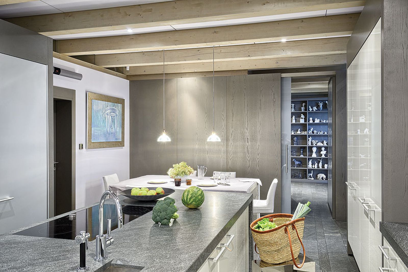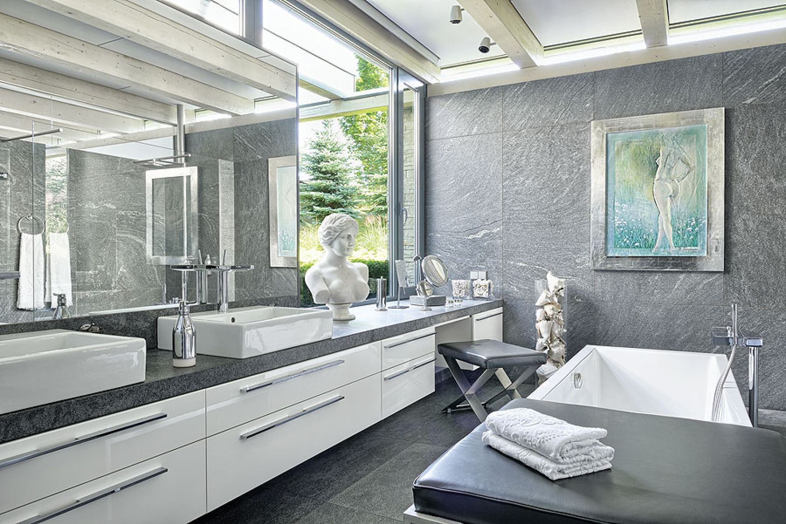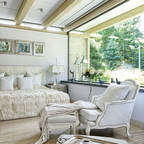 Pierwsza propozycja od razu jej się spodobała. Tylko naturalne materiały: kamień, szkło, drewno. Mnóstwo przeszkleń i aż jedenaścioro drzwi, z każdego pokoju można wyjść do ogrodu. – Uwielbiam światło, słońce – mówi – dach nigdzie nie styka się ze ścianami. Dookoła pod sufitem biegnie długi płaski świetlik. Gdy się stanie na pagórku po jednej stronie ogrodu, drugi koniec widać przez te okna. Dzięki lekkiej konstrukcji budowa trwała krótko, tylko rok i nie było bałaganu, jak to zwykle podczas prac murarskich. Po niespełna dwóch latach rodzina zamieszkała w 650-metrowej rezydencji.