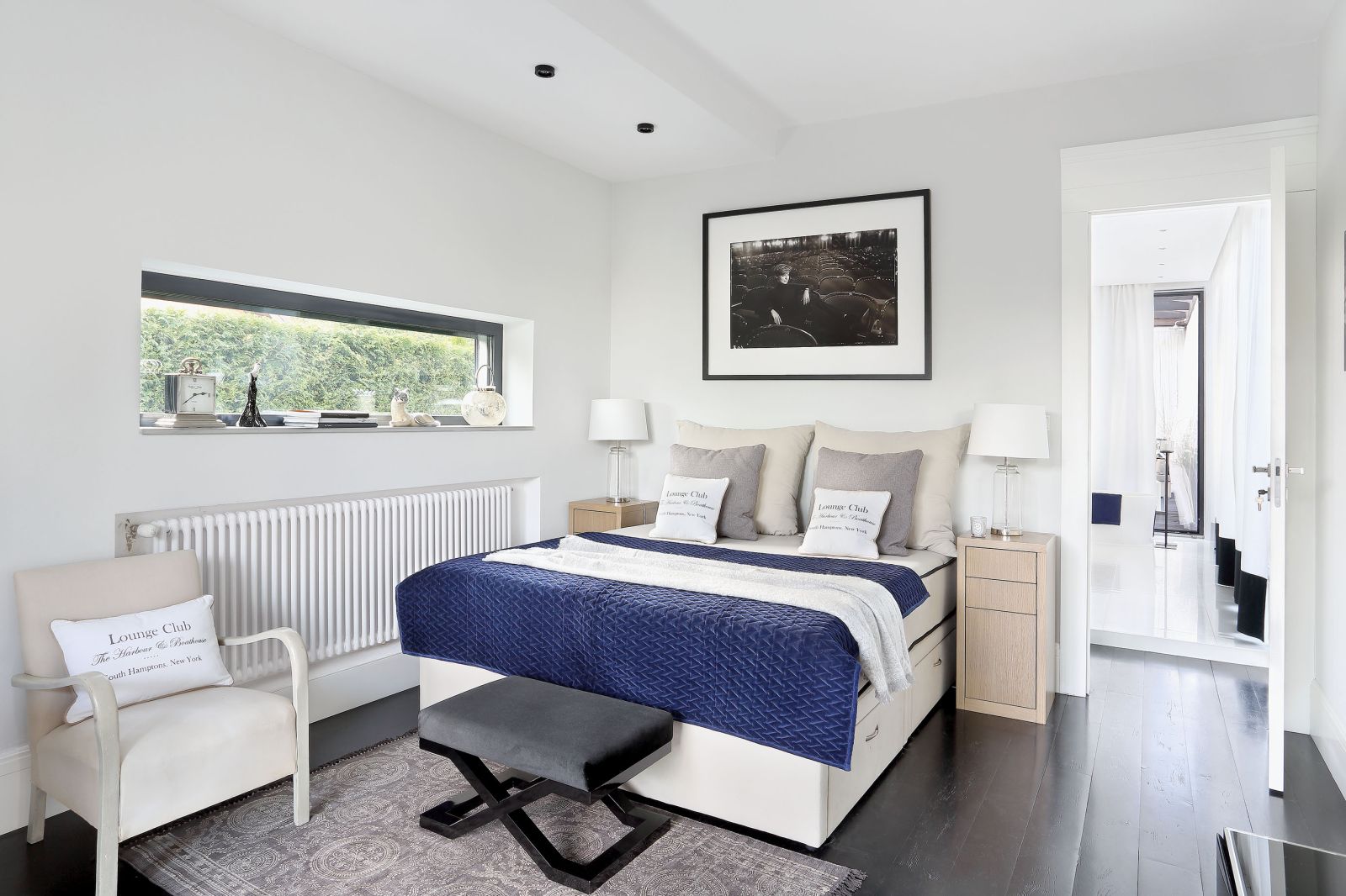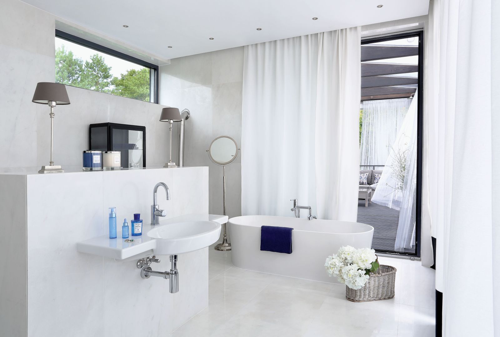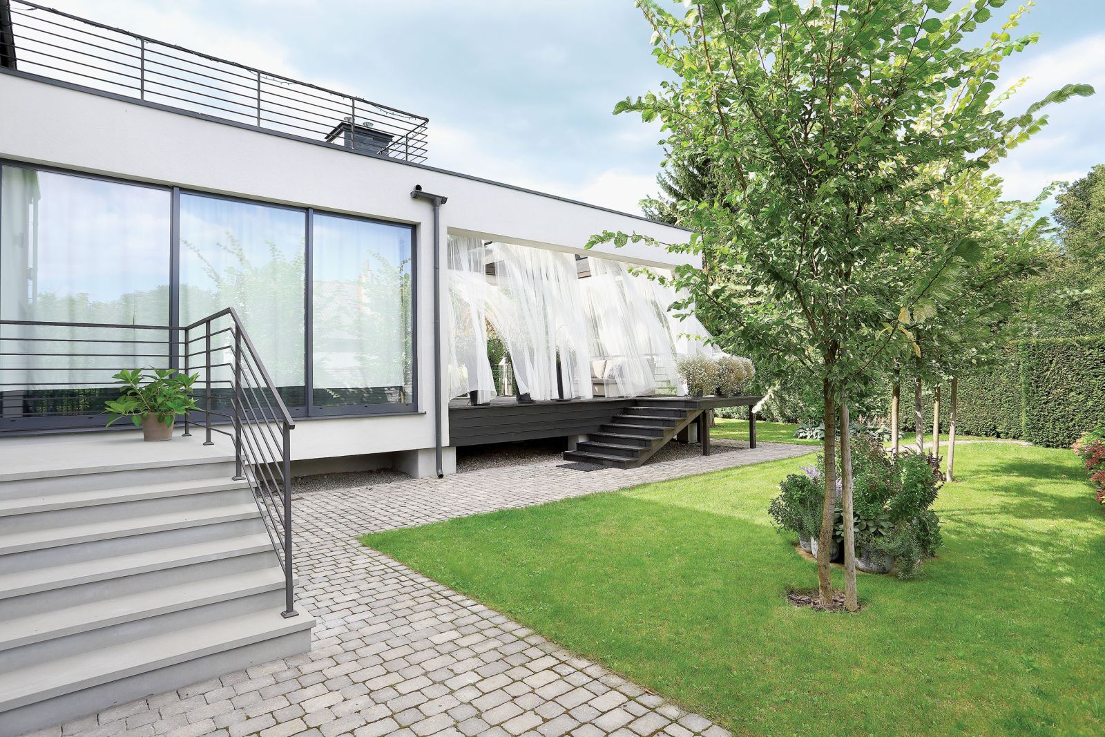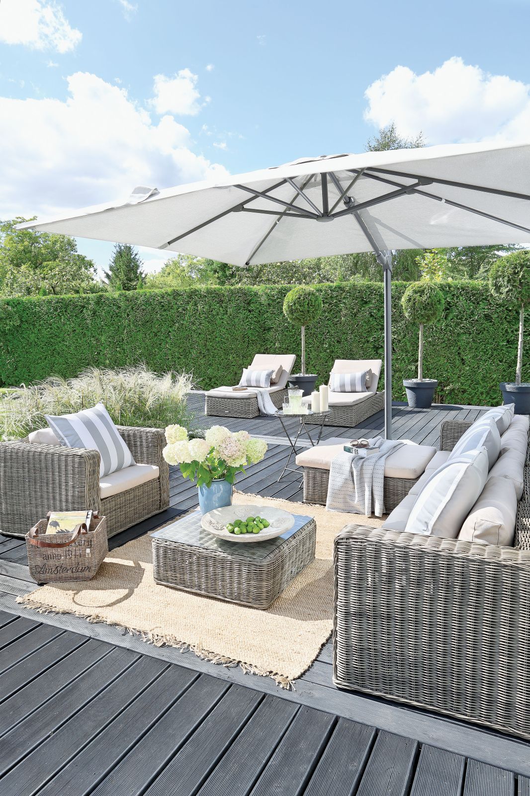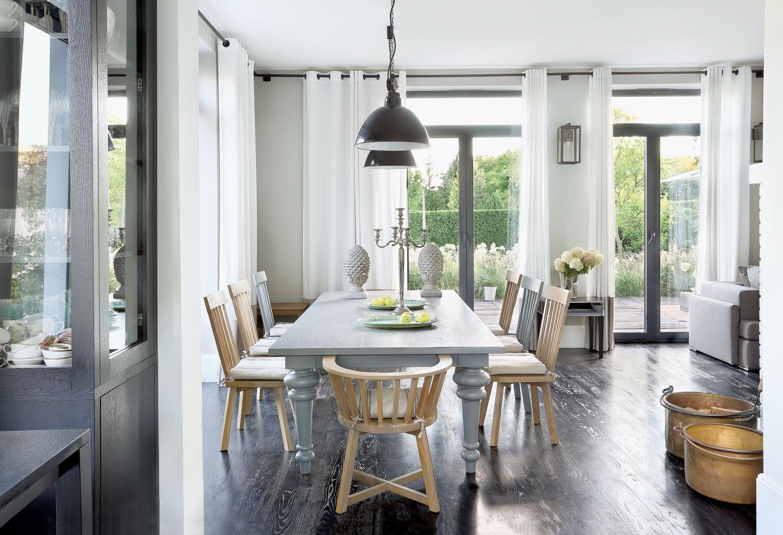 Ogród skomponowany jest podobnie jak dom: mnóstwo bieli i falujących na wietrze traw z jasnymi puchatymi pióropuszami. Spokojny i klasyczny, otoczony murem zieleni.